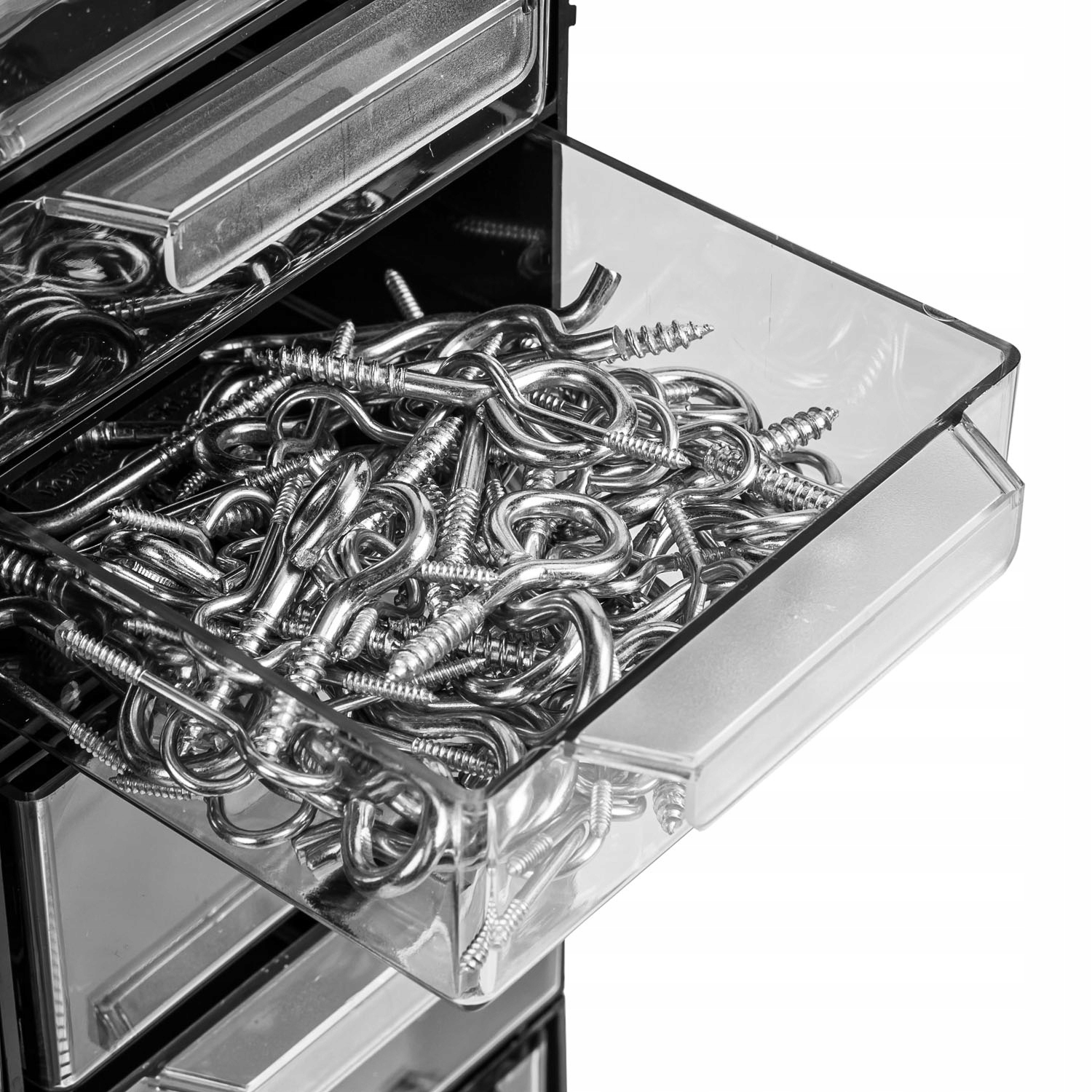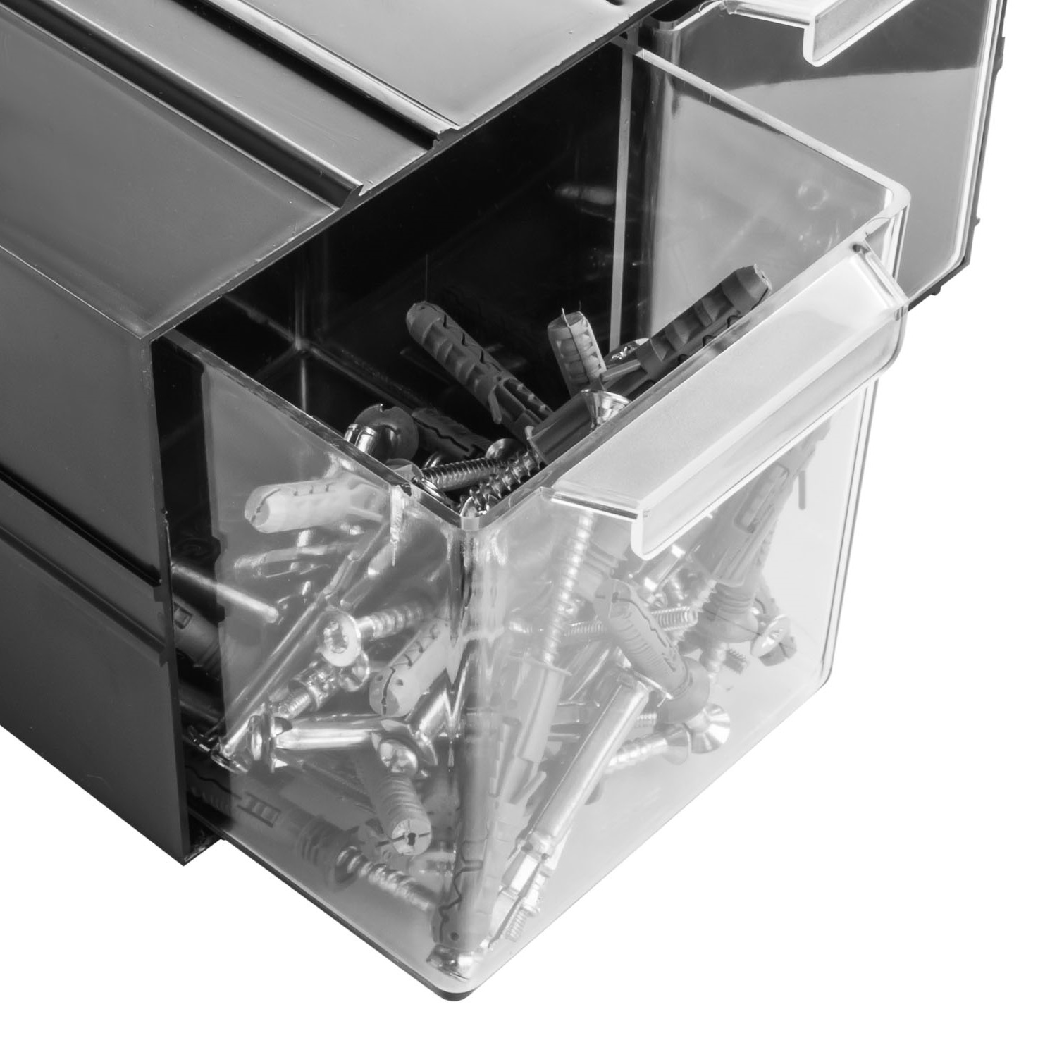 Набор контейнеров с прозрачными ящиками, идеально подходит для организации мастерской, склада и других рабочих мест. Контейнеры практичны, поскольку их можно объединить в один органайзер большего размера или разделить и разместить в разных местах, в зависимости от ваших потребностей. В ящиках разного размера можно хранить предметы разного размера, от маленьких шурупов до более крупных аксессуаров, что поможет вам оставаться организованным и экономить время на поиске нужных предметов.