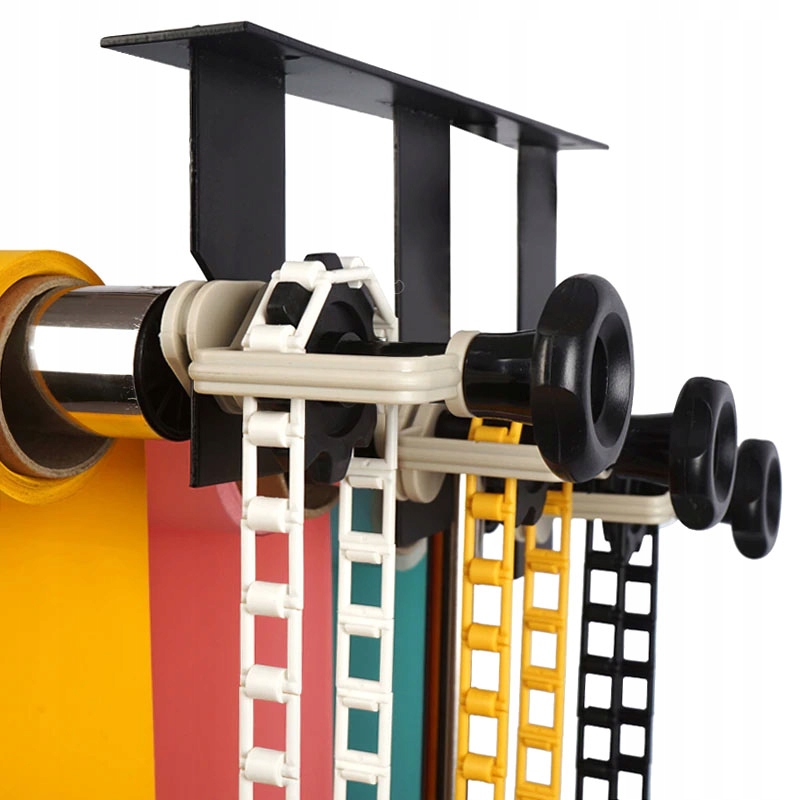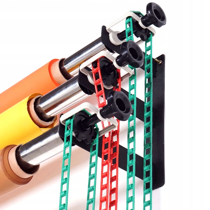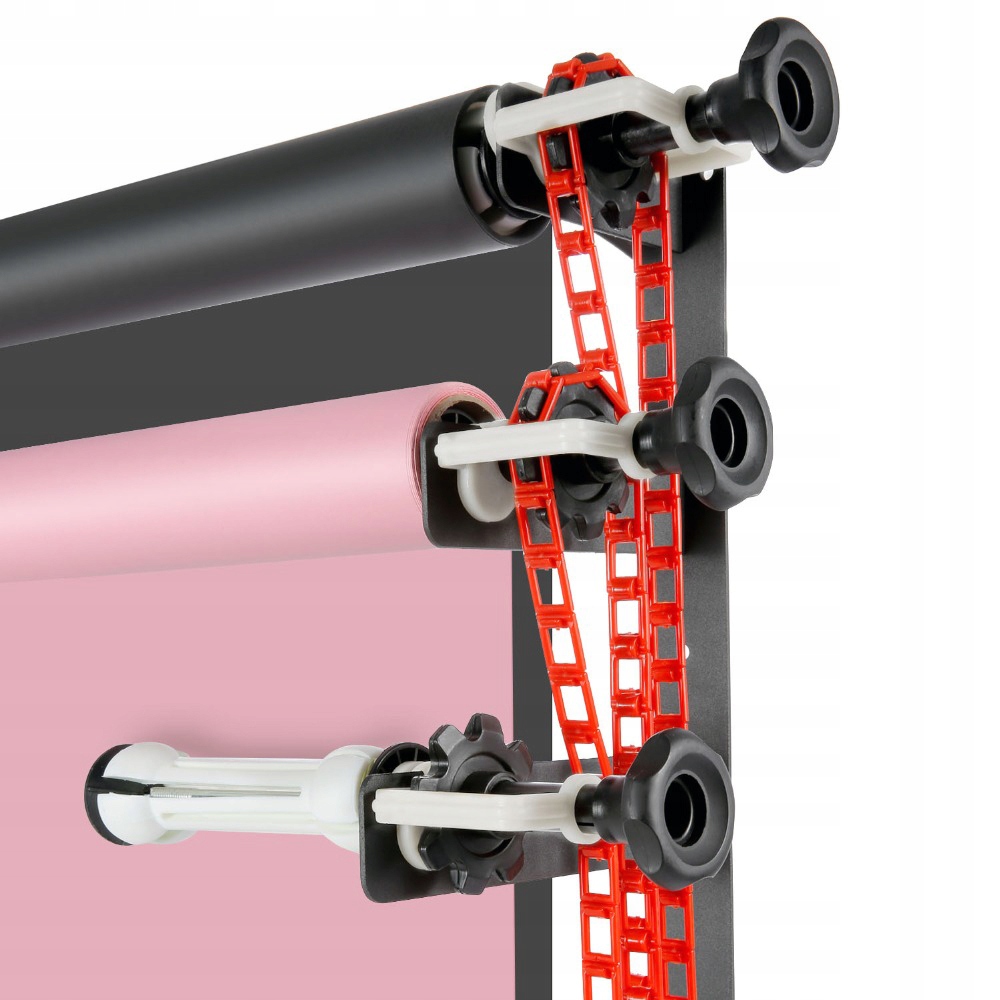 Фоны разматываются и наматываются с помощью специально сконструированной ленты, которая закрепляется на верхняя часть защищает от случайного соскальзывания, а нижняя часть имеет грузик b> для обеспечения соответствующего натяжения. Винты на левой стороне регулируют силу давления, что предотвращает самостоятельное раскручивание более тяжелых задников.