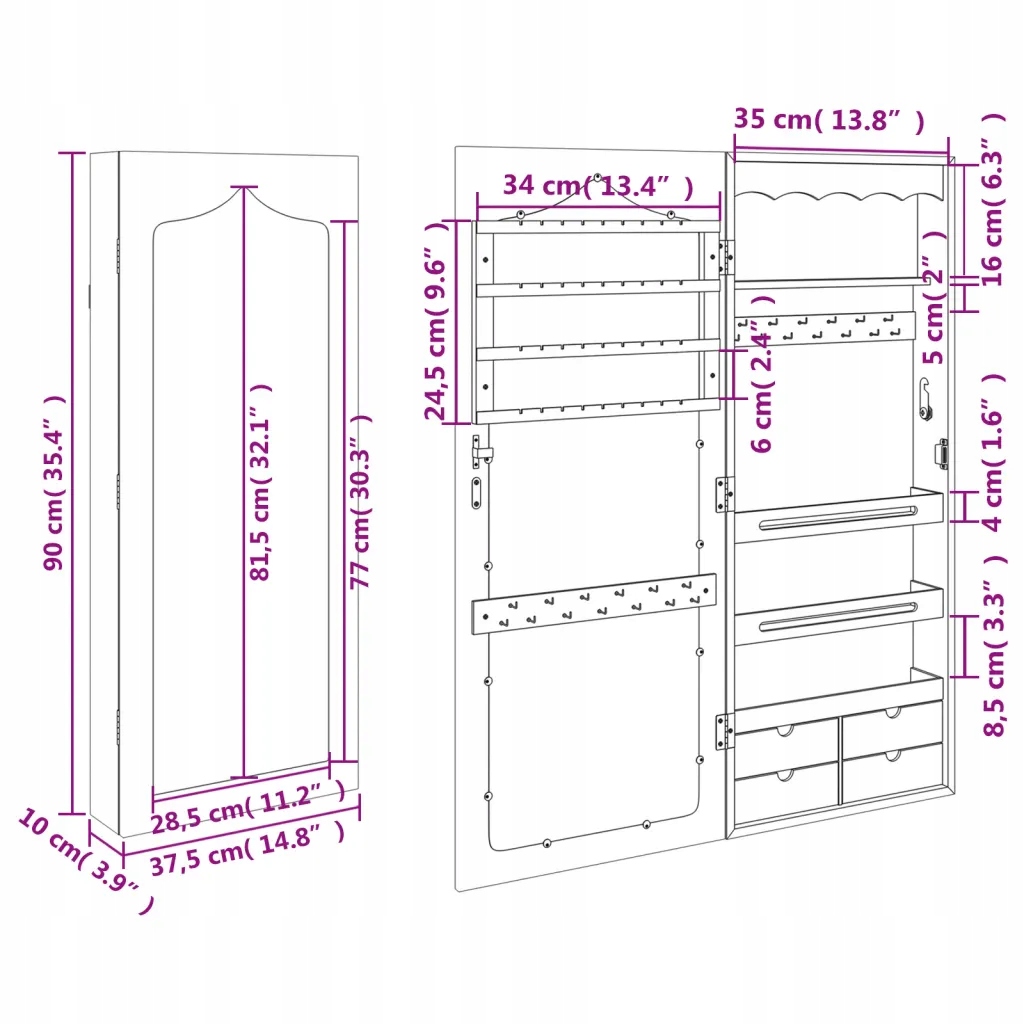 шкаф для висящих ювелирных изделий с зеркалом, 37,5x10x90 см h1>