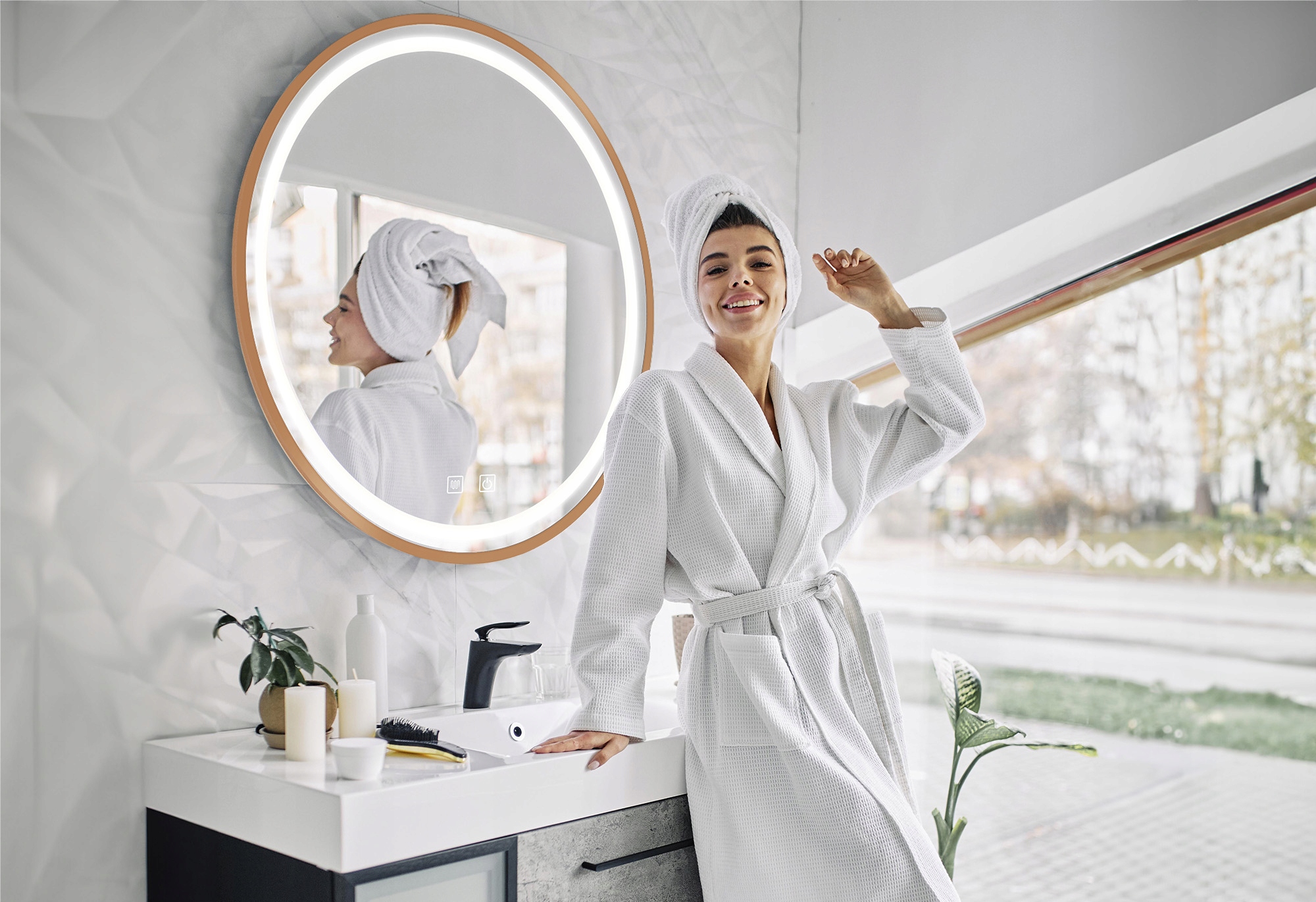 Зеркало изготовлено из материалов высочайшего качества, идеально подходит для презентов и очень долговечно. Он имеет на выбор три цвета светодиодной подсветки, которые можно менять прикосновением: теплый, нейтральный и холодный. Удерживая пальцем кнопку с подсветкой на сенсорной панели, вы можете отрегулировать интенсивность света.