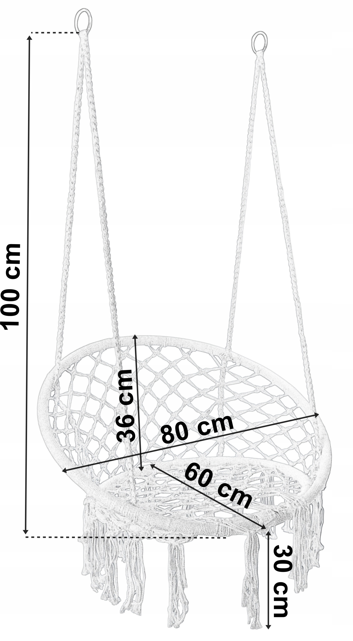 В Того толстые и прочные хлопковые шнуры. Металлические кольца гарантируют безопасность во время использования и позволяют закрепить подвесное кресло двумя способами.