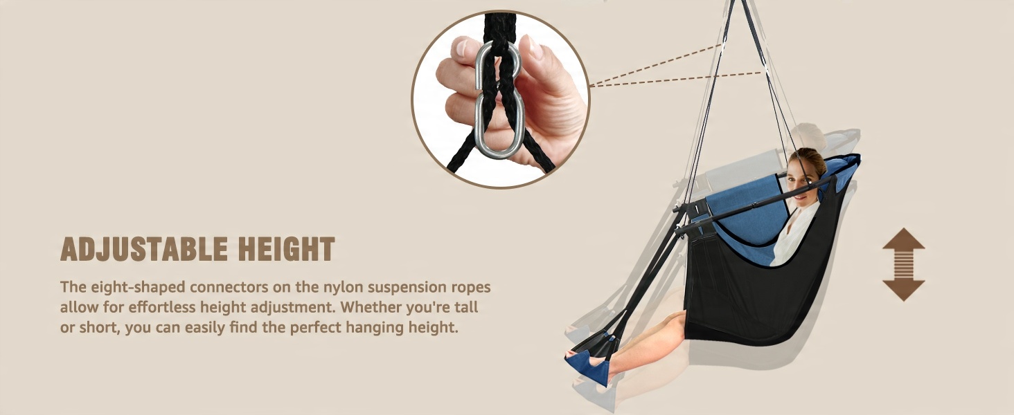 Универсальный комфорт: это вращающееся кресло U-образной формы с прочной железной рамой предлагает универсальные варианты сидения с регулируемой подставкой для ног и нейлоновой подвеской. веревки, оснащенные восьмерочными соединителями. Сиденье и спинка обеспечивают лучшую поддержку поясницы и позвоночника. Подставка для ног снимает усталость ног. Хотите ли вы сесть прямо и почитать книгу или откинуться назад и спокойно вздремнуть, вы можете легко отрегулировать угол и высоту для максимального комфорта в соответствии с вашими предпочтениями.