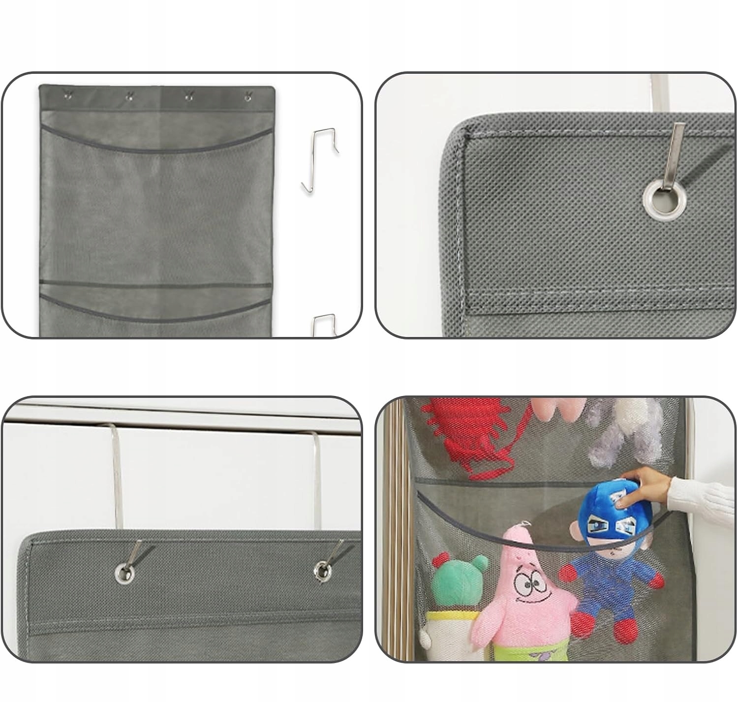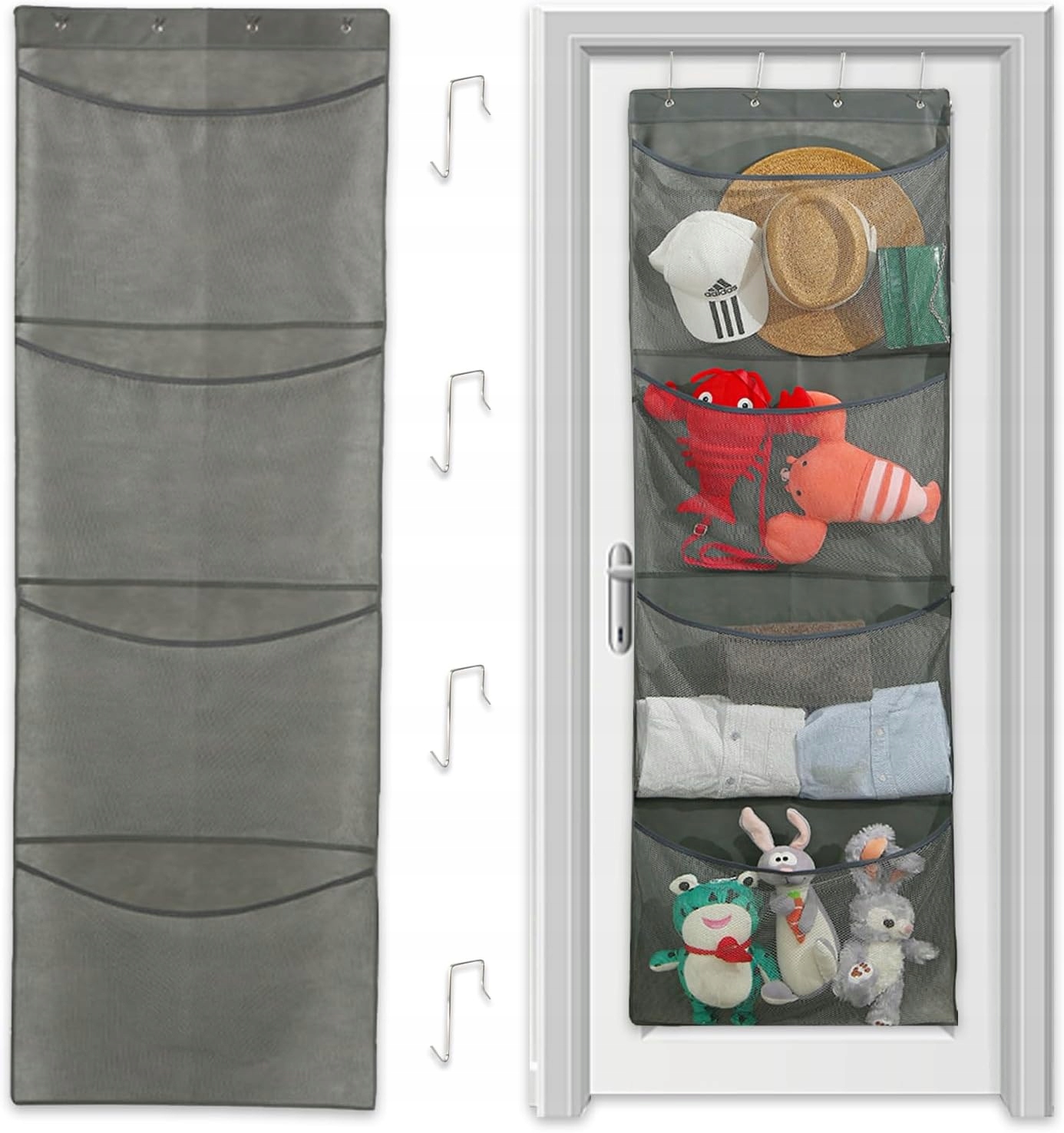 В комплект входят 4 регулируемых металлических крючка, которые позволяют повесить органайзер на дверь, не повредив ее. Совместим с большинством стандартных дверей.
