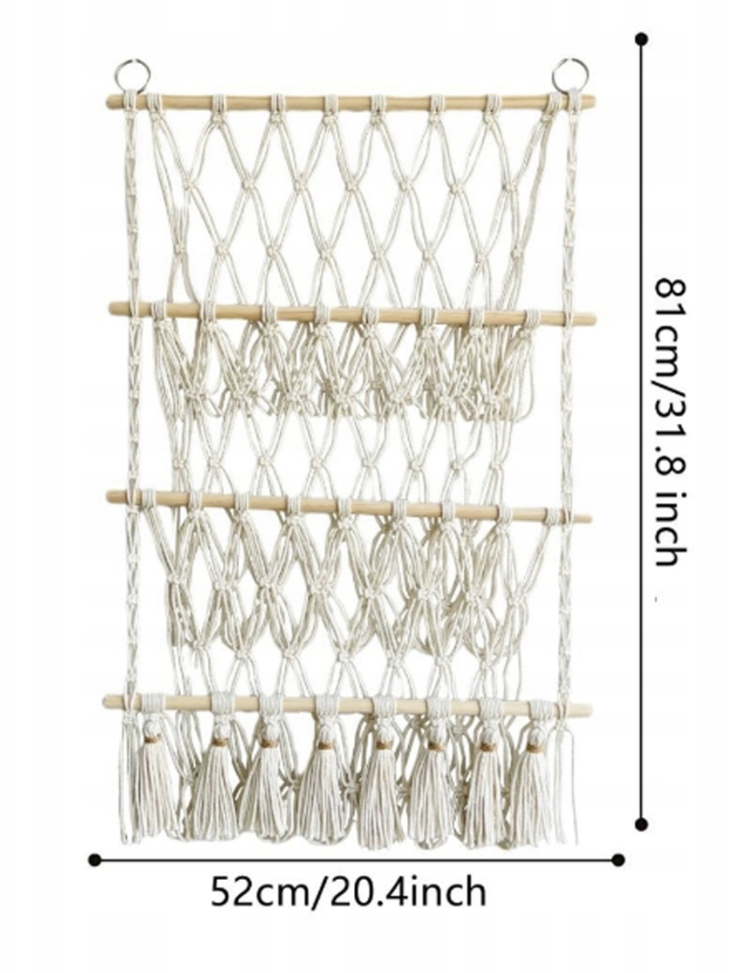 - Порядок и украшение в одном: Это не обычный игрушечный контейнер! Сплетенное вручную макраме из натуральной веревки и деревянных шестов — красивое настенное украшение, которое придаст тепла и характера любому интерьеру в модном стиле бохо.