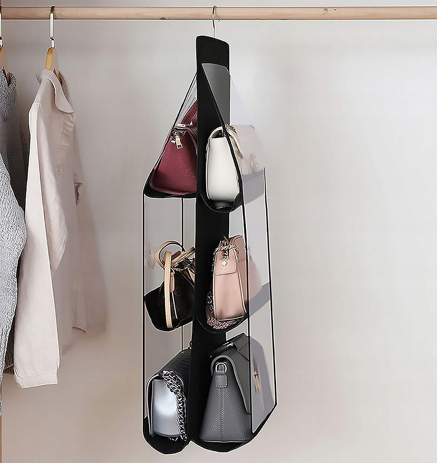 Подвесной органайзер можно легко повесить на штангу в шкафу или гардеробной, что обеспечивает быстрое и удобное использование.