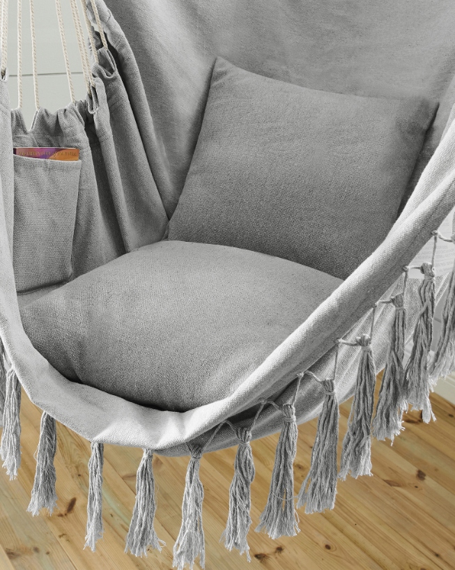 Свингевое кресло оборудовано не только набором из двух подушек, но и с мешком для путешествий и карманом для различных предметов, таких как книги, телефоны и очки. Это реальное решение «все в одном», которое принесет новое измерение для вашего удобного расслабления.
