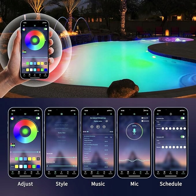 - Расписание и синхронизация музыки: Вы можете автоматически включать и выключать освещение бассейна в нужное время в зависимости от установленного вами расписания. Оснащенный высокочувствительным звуковым датчиком, он может мигать синхронно с музыкой или даже голосом. Добавьте веселья в плавание!