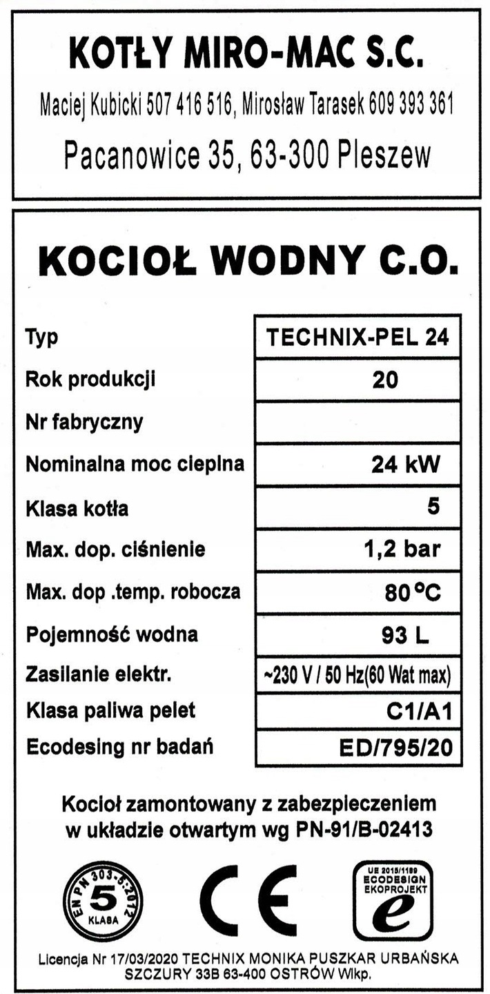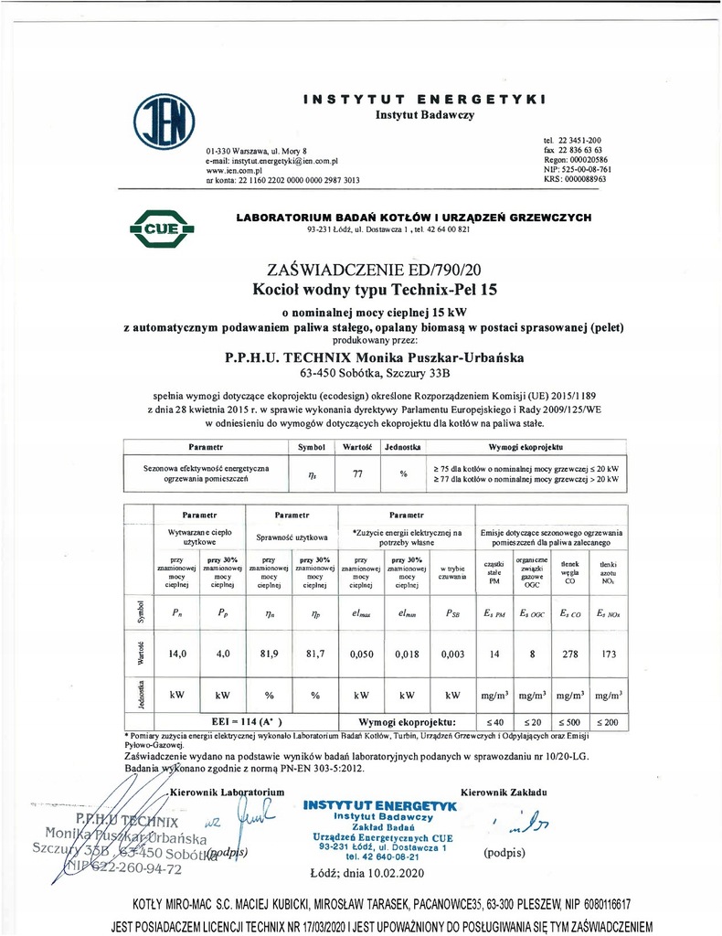 Котел прошел испытания в двух независимых государственных лабораториях. Каждый из них наградил котел сертификатом соответствия классу 5 (PN-EN 303-5: 2012) и сертификатом экодизайна (2020-2009/125/EC).