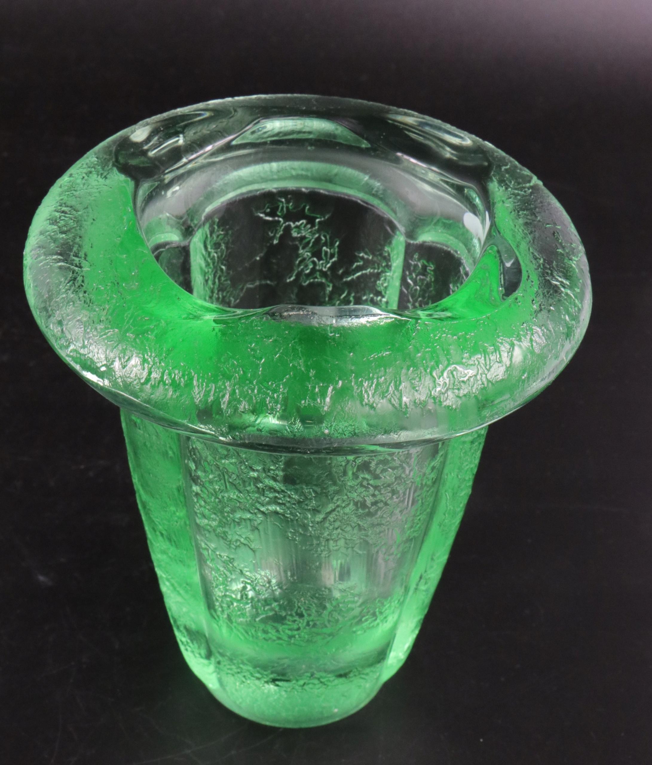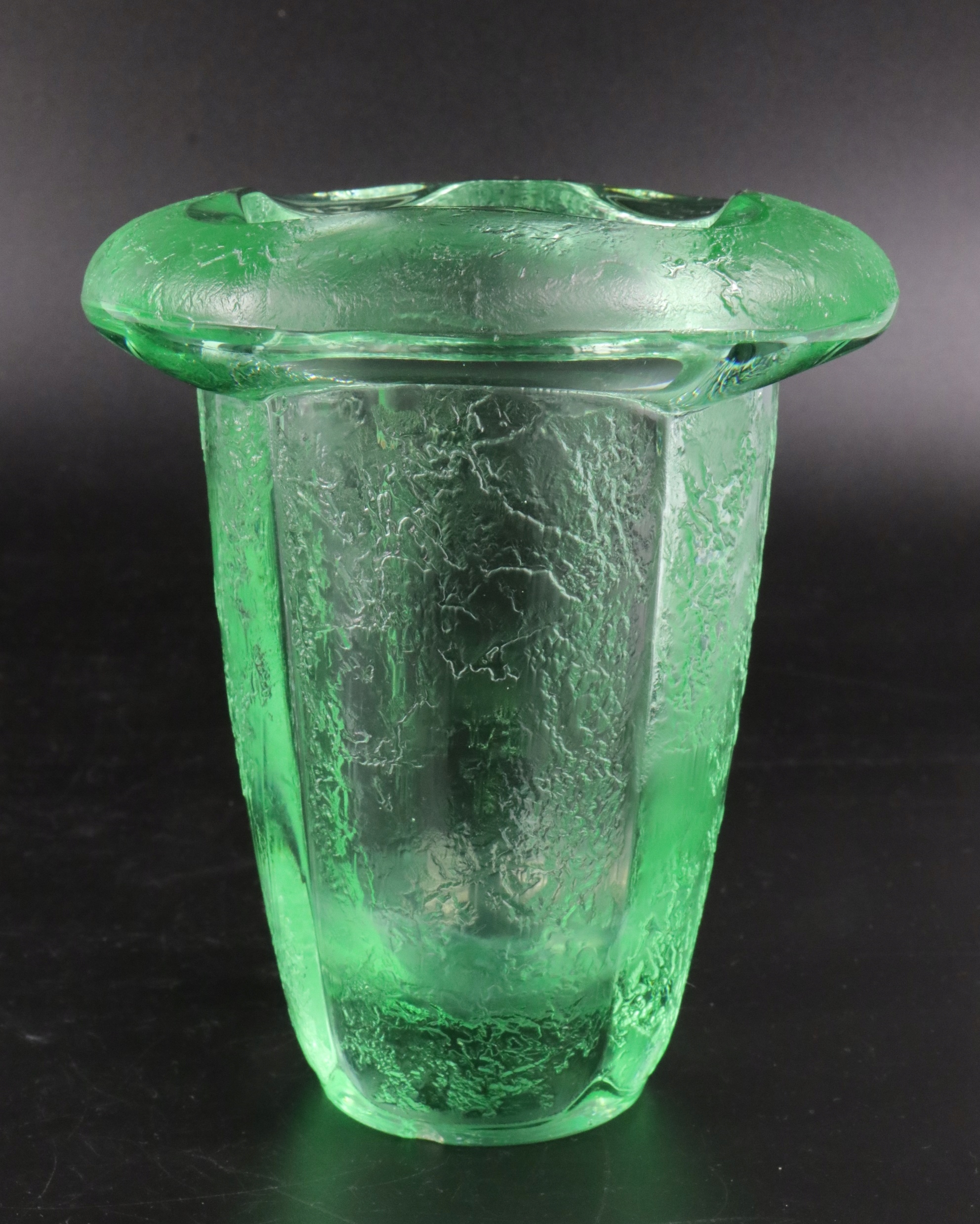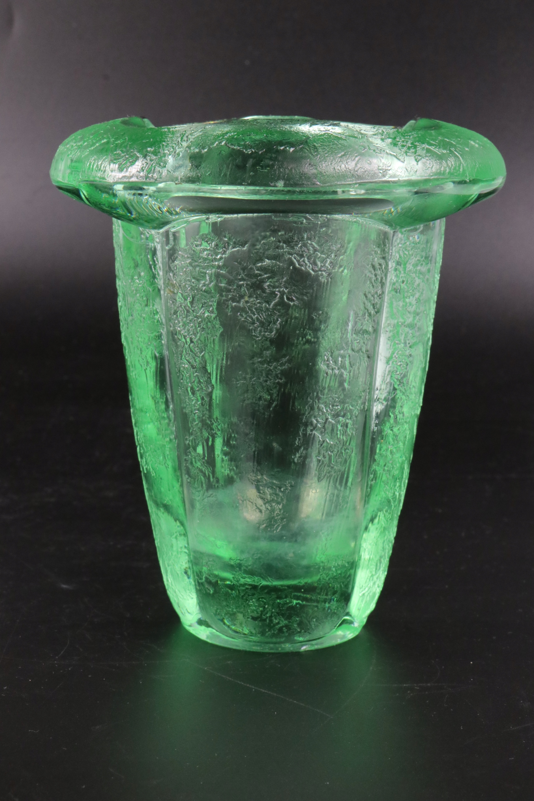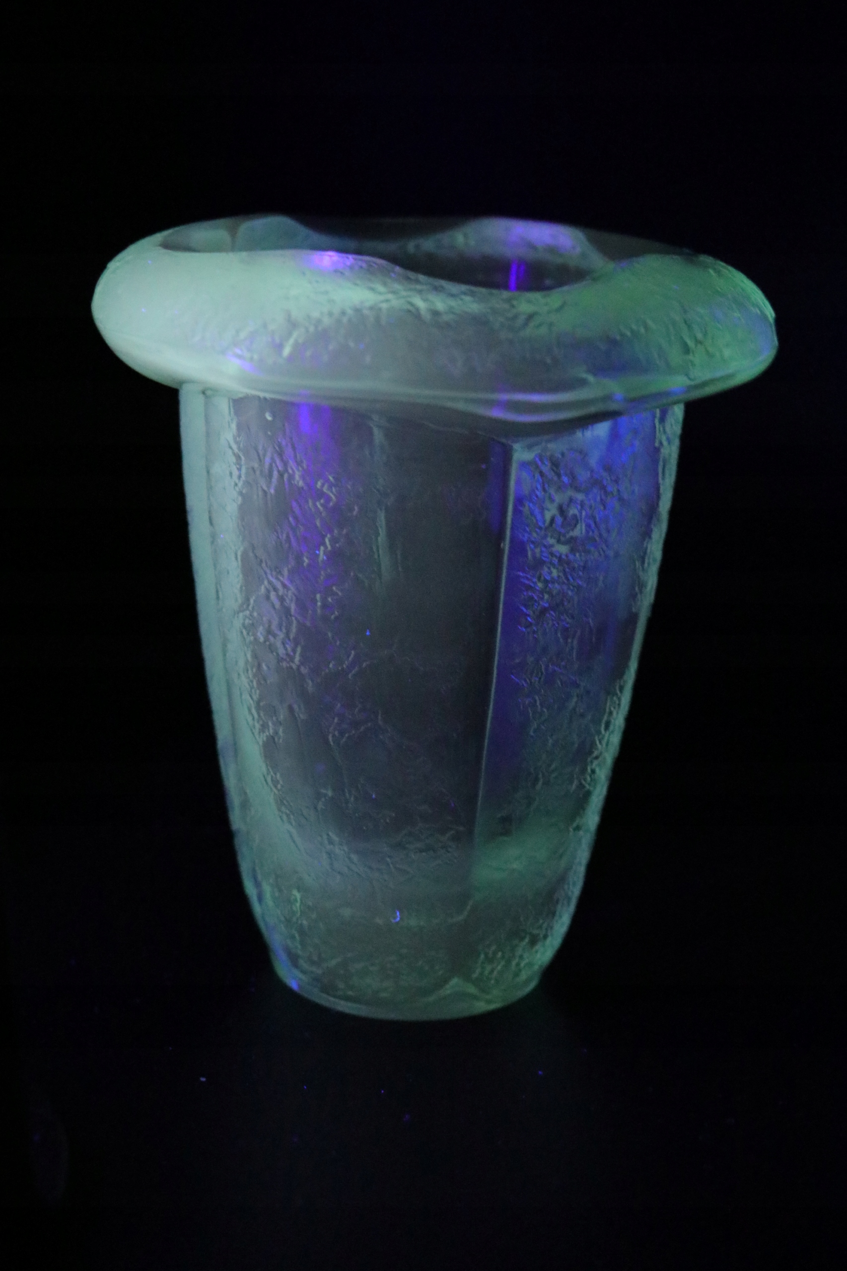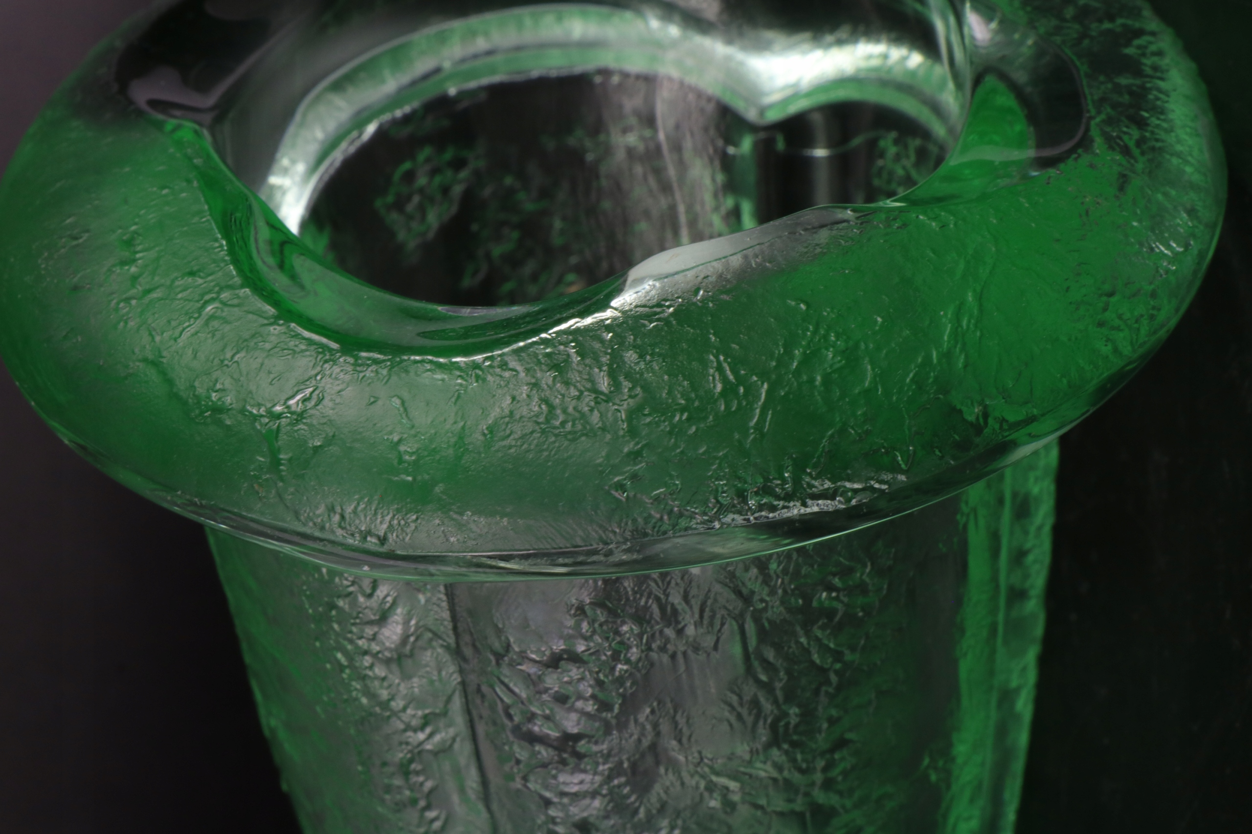 Стеклянная ваза, спроектированная Пьером Д'Авенсом для Daum. Толстое, массивное, зеленое травленое стекло. Стекло с добавлением уранового стекла на последних двух фотографиях в УФ-свете. Ваза не подписана.