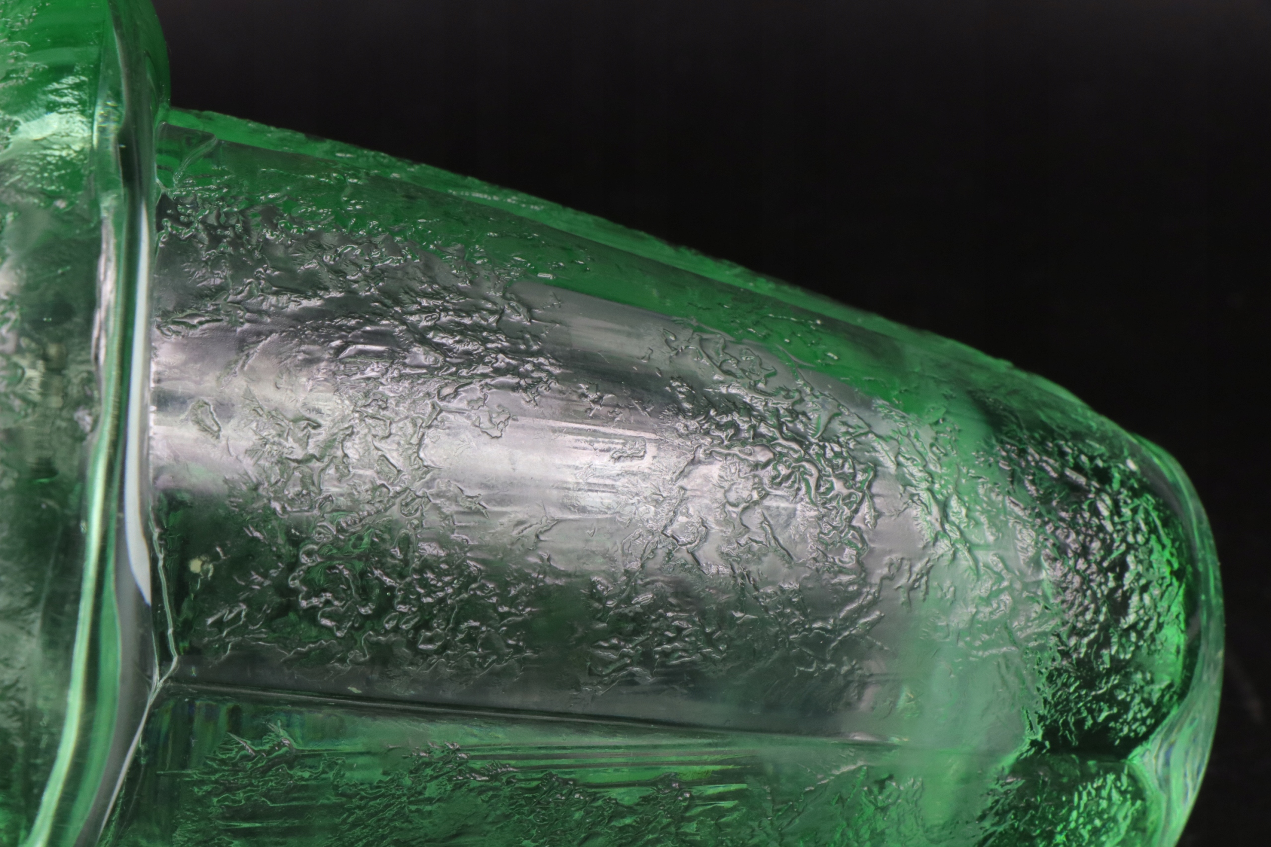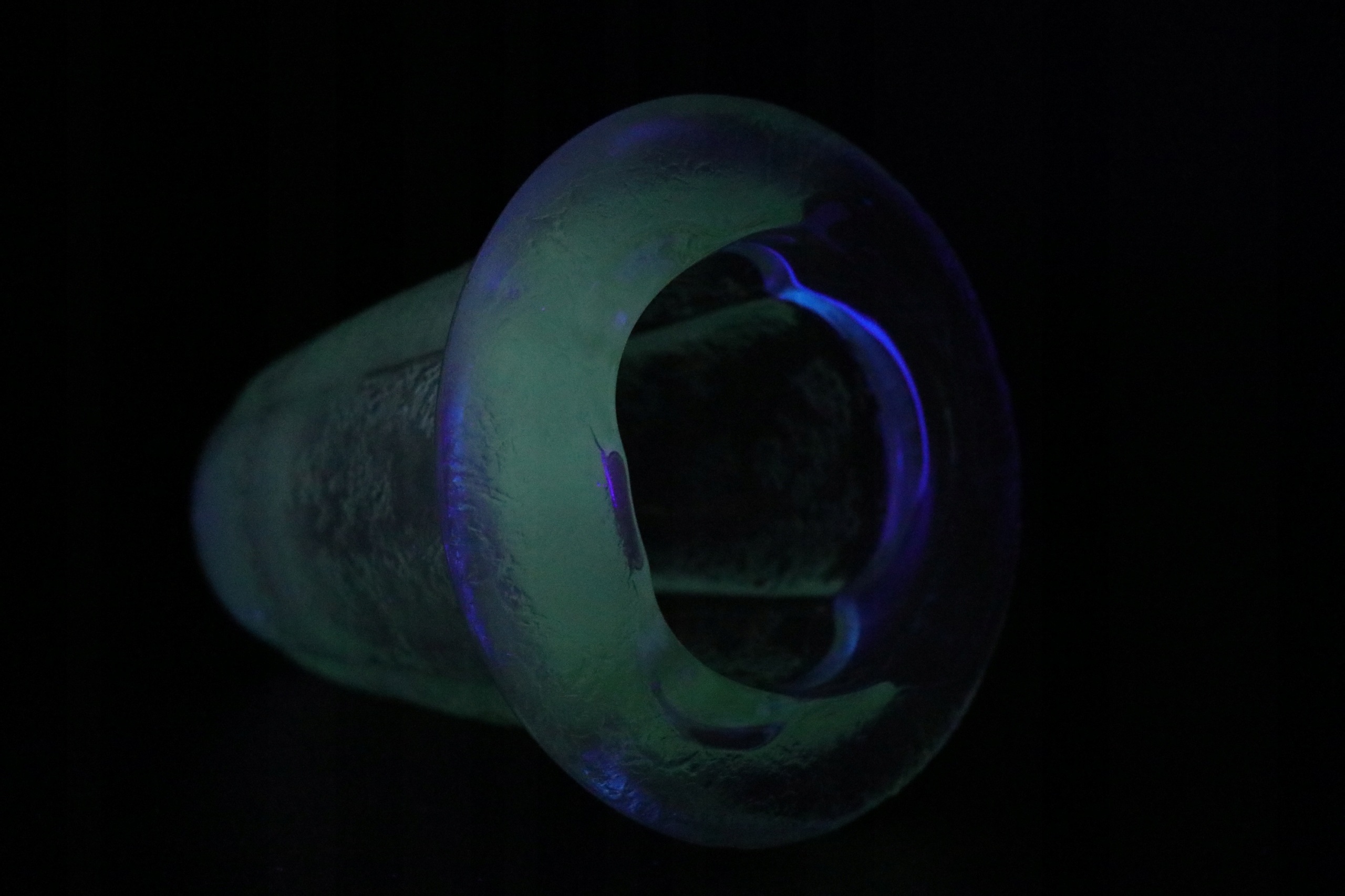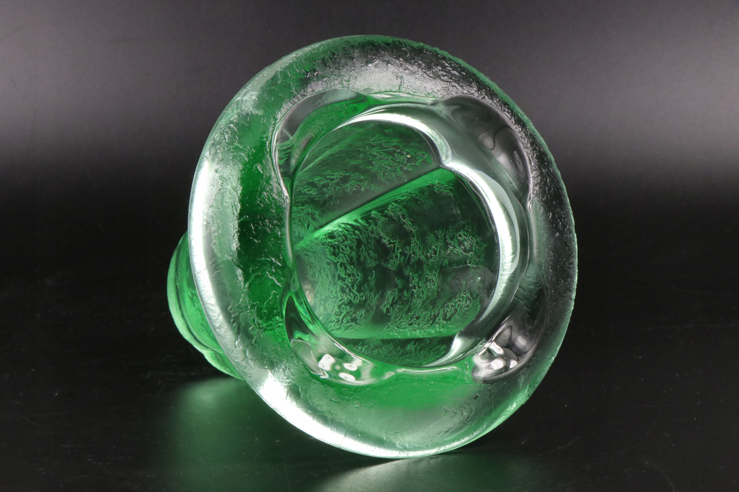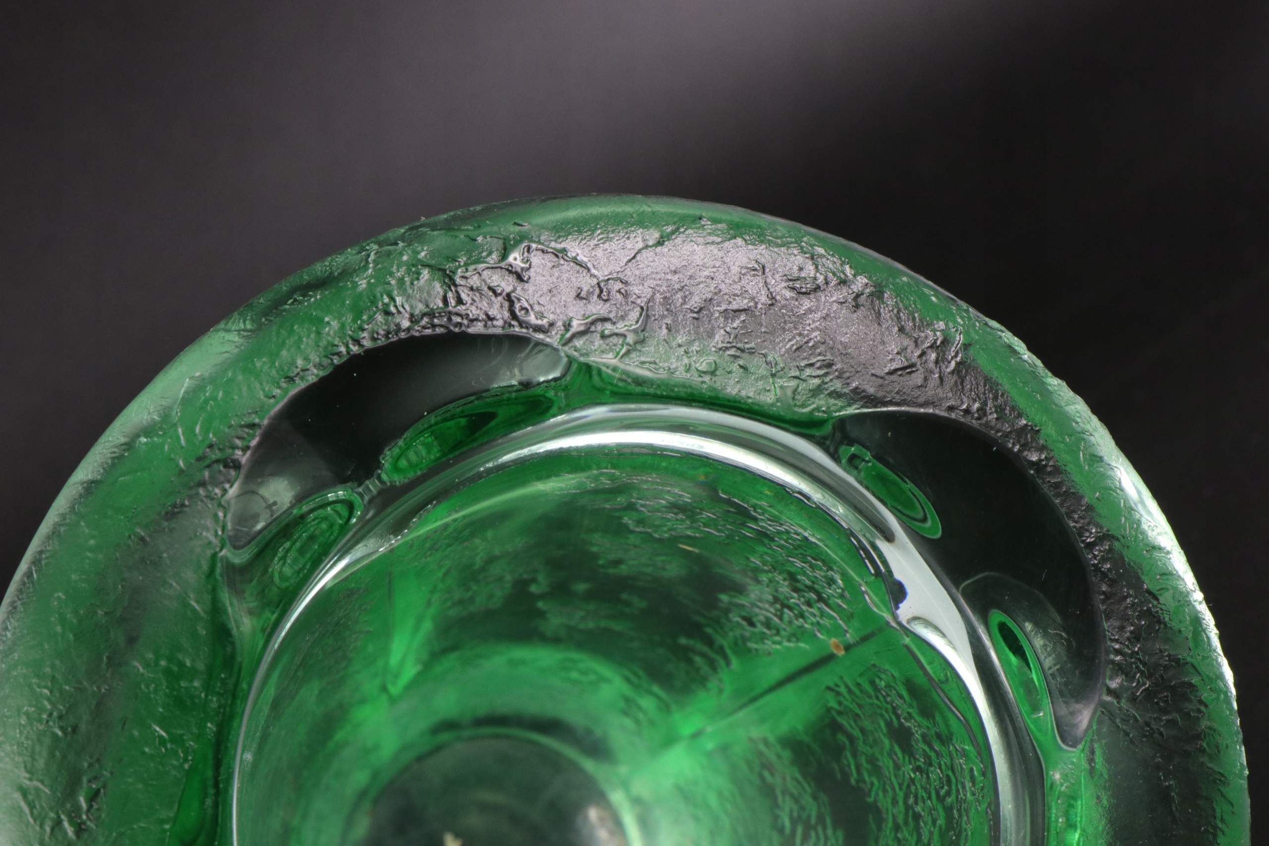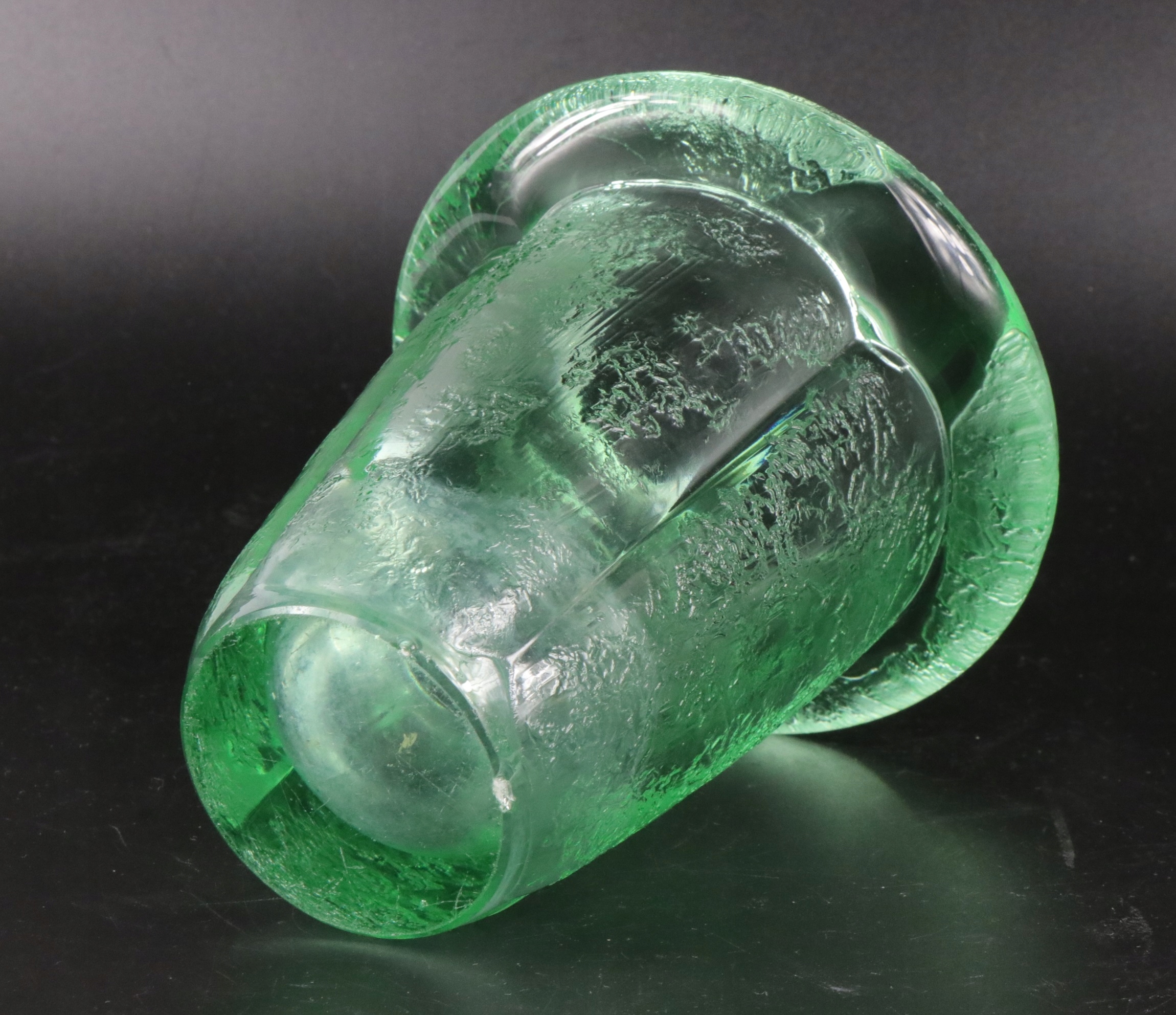 Стеклянная ваза, спроектированная Пьером Д'Авенсом для Daum. Толстое, массивное, зеленое травленое стекло. Стекло с добавлением уранового стекла на последних двух фотографиях в УФ-свете. Ваза не подписана.