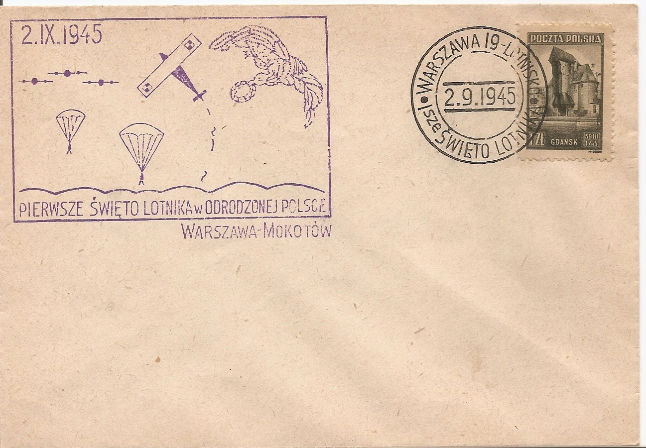PIERWSZE ŚWIĘTO LOTNIKA W ODRODZONEJ POLSCE -koperta stemple 1945 rok