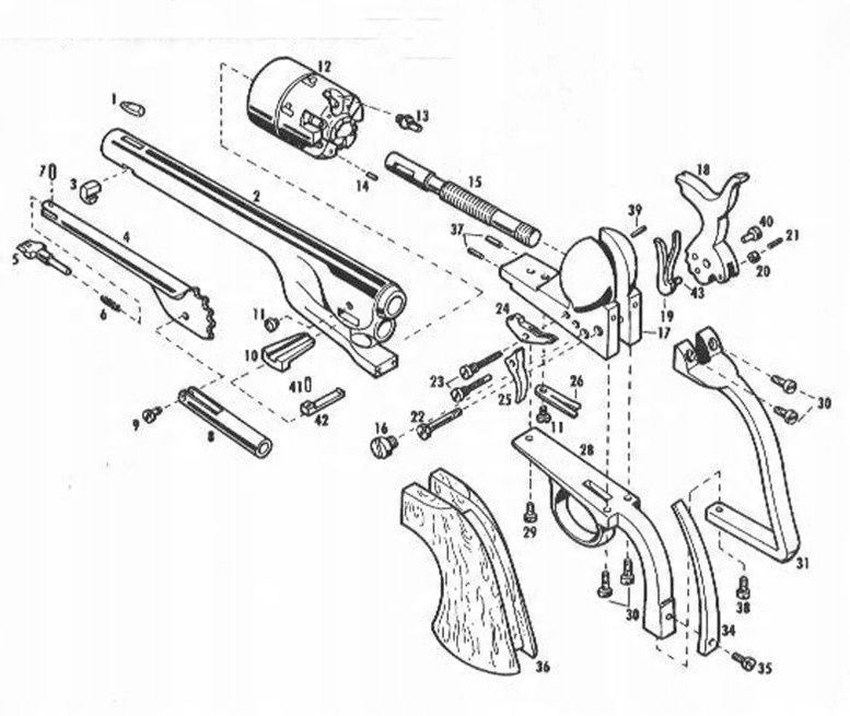 Для вышеупомянутого револьвера рекомендуется использовать черный порох с грануляцией 3F (FFFG) массой 0,8- 1 грамм/12-15 гран и пули размером .454"/11,53мм.