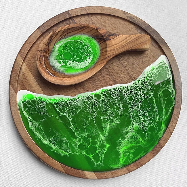 - Красители NANO COLOR совместимы с Crystalline 940, Gloss Coat, Epidian 652 + IDA, Epidian Deco + Deco K, Epidian Deco + Deco, Techniplast 400, EC 1200 и, возможно, со многими другими, но из-за очень большого количества разновидностей эпоксидных смол опробовать со всеми не удалось. Поэтому перед началом проекта вам следует протестировать его на небольшом количестве смолы, чтобы определить его пригодность в вашем случае, поскольку сочетание красителей с другими смолами может дать другой цветовой результат. Представленные на фотографиях образцы изготовлены на кристаллической бесцветной смоле Crystalline 940.