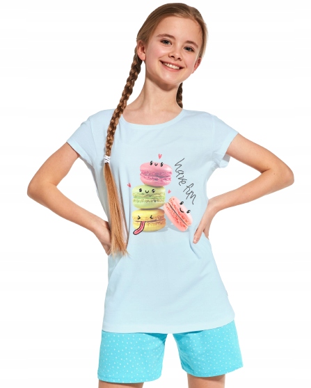 Pajamas 788/97. Рубашка с короткими рукавами и круглым вырезом хранится в голубом. Центральная часть имеет отпечаток из четырех макаронов и надпись: «Получайте удовольствие». Бирюзовые шорты имеют широкую подстриженную резину на талии. На всей поверхности материала есть рисунок с маленькими серо-голубыми точками в горошек. Это чрезвычайно удобное девичье нижнее белье, нежное для кожи. Идеально подходит для теплых весенних и летних вечеров.