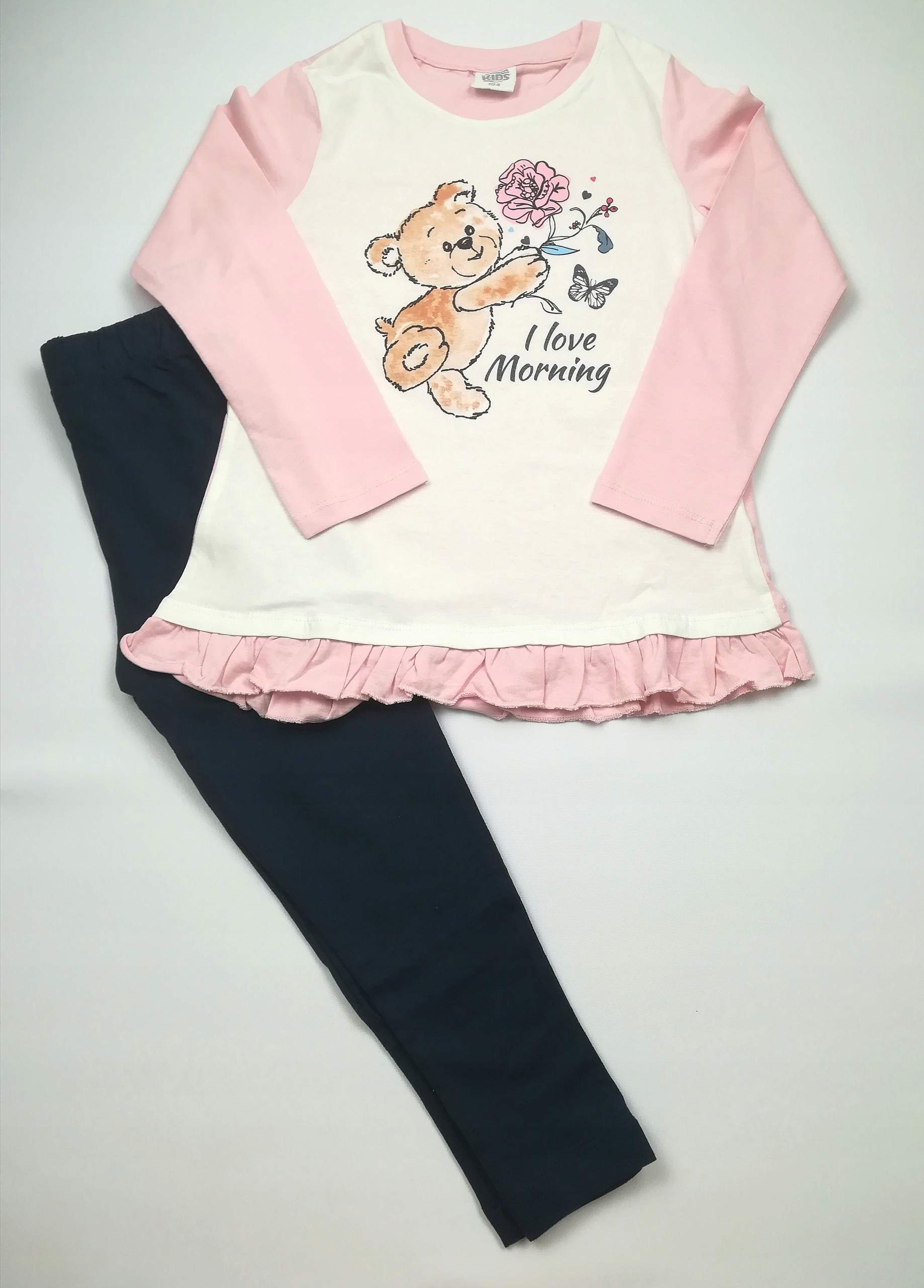 Длинная пижама для девушки. Украшен тонким Файбаном и применением от плюшевого мишка. Длинные темно -синие, слегка суженные шорты, поэтому они не искажают свои силуэты.
