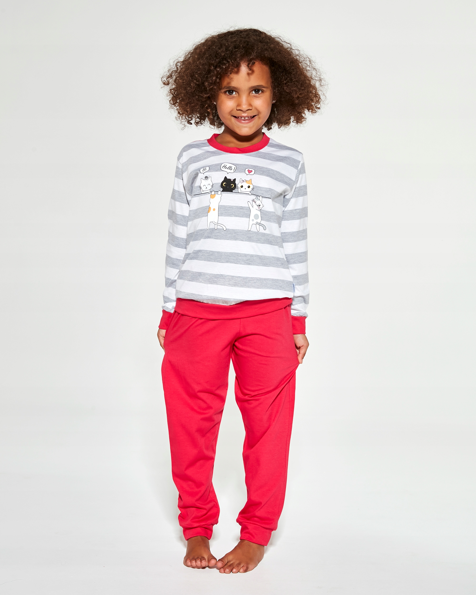 Двойная пижама для девочек из высококачественного хлопка. Белая футболка с длинными рукавами имеет рисунок в виде серых меланжевых полос по всей поверхности материала. В центральной части принт с изображением пяти маленьких котят. Длинные малиновые брюки с широкой талией на резинке. Горловина, манжеты, низ рубашки и штанины отделаны розовыми манжетами. Это чрезвычайно комфортное нижнее белье для девочек, нежное к коже. Идеально подходит для холодных осенних и зимних вечеров.