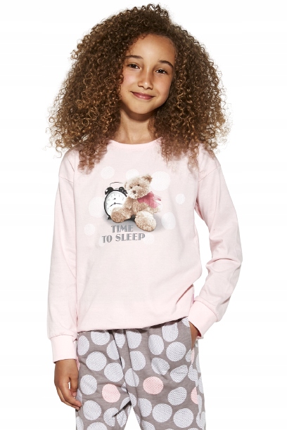 Двухкомпонентная пижама для девочек из высококачественного натурального хлопка. Футболка с длинными рукавами и круглым вырезом бледно-розового цвета. В центральной части принт плюшевого мишки рядом с будильником и надпись: «Время спать». Длинные пижамные брюки от серого до коричневого цвета с широкой талией на резинке. По всей поверхности материала нанесен узор из крупных белых горошек. На каждом колесе имеются розовые или серо-коричневые зигзаги. Брюки имеют два практичных кармана на уровне бедер. Горловина, манжеты и штанины отделаны манжетами. Это чрезвычайно комфортное нижнее белье для девочек, нежное к коже. Идеально подходит для холодных осенних и зимних вечеров.