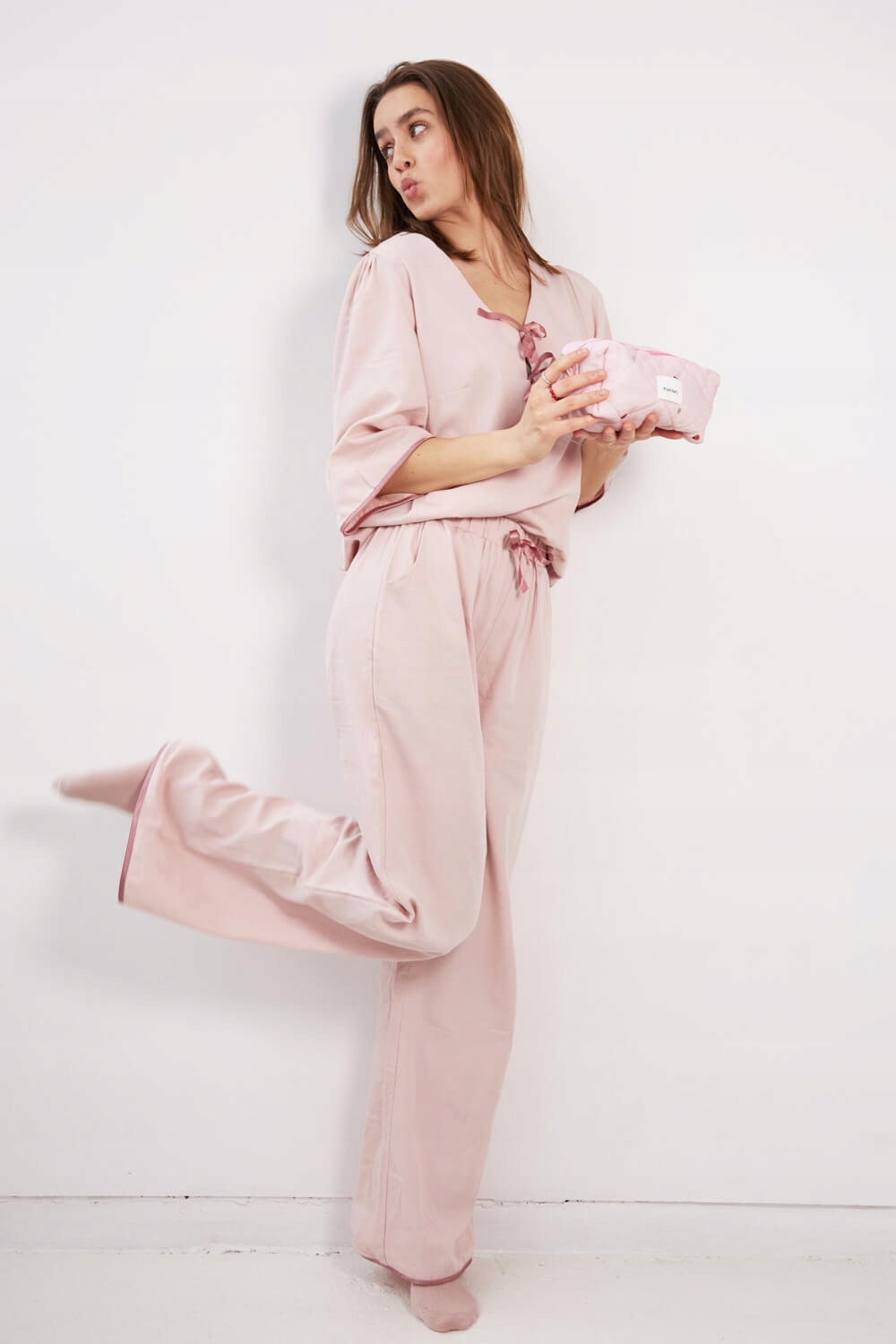 В комплект входят свободная рубашка и брюки. Рубашка с широкими рукавами, изящными буфами на плечах и завязанным бантиками вырезом позволяет кормить грудью, если вы мама. Края декорированы розовой окантовкой.