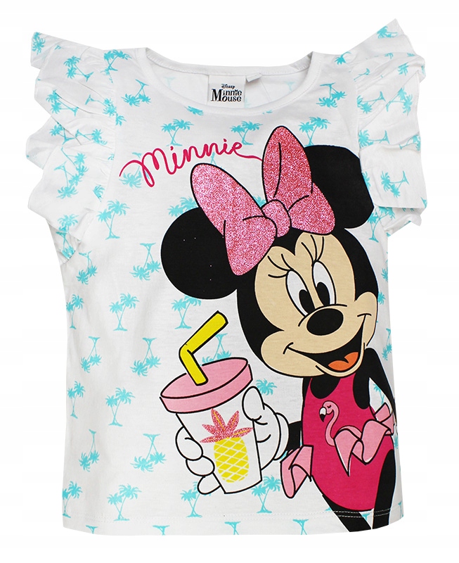 Перед блузки украшен красивым нежным принтом с Минни Маус, украшенным блестками