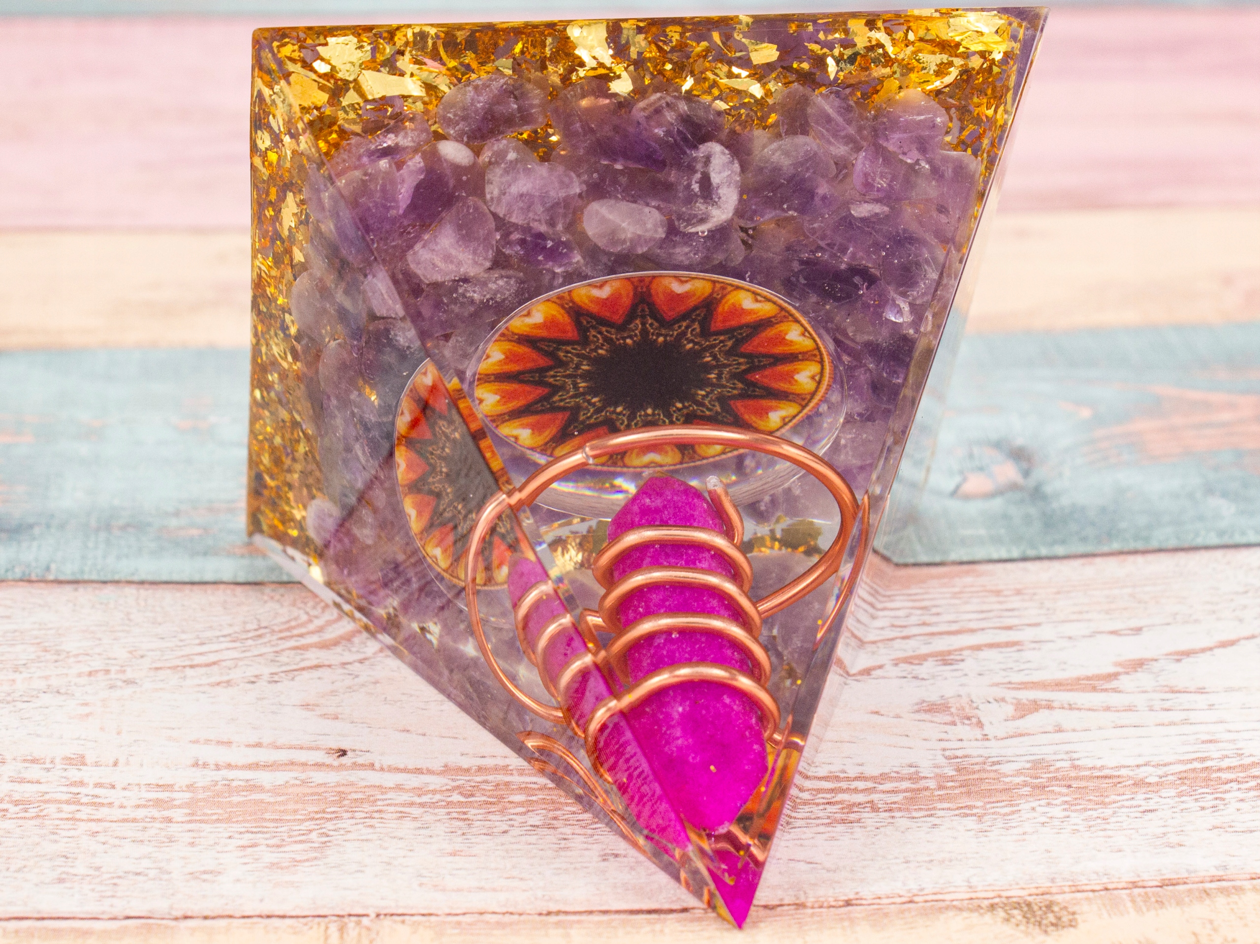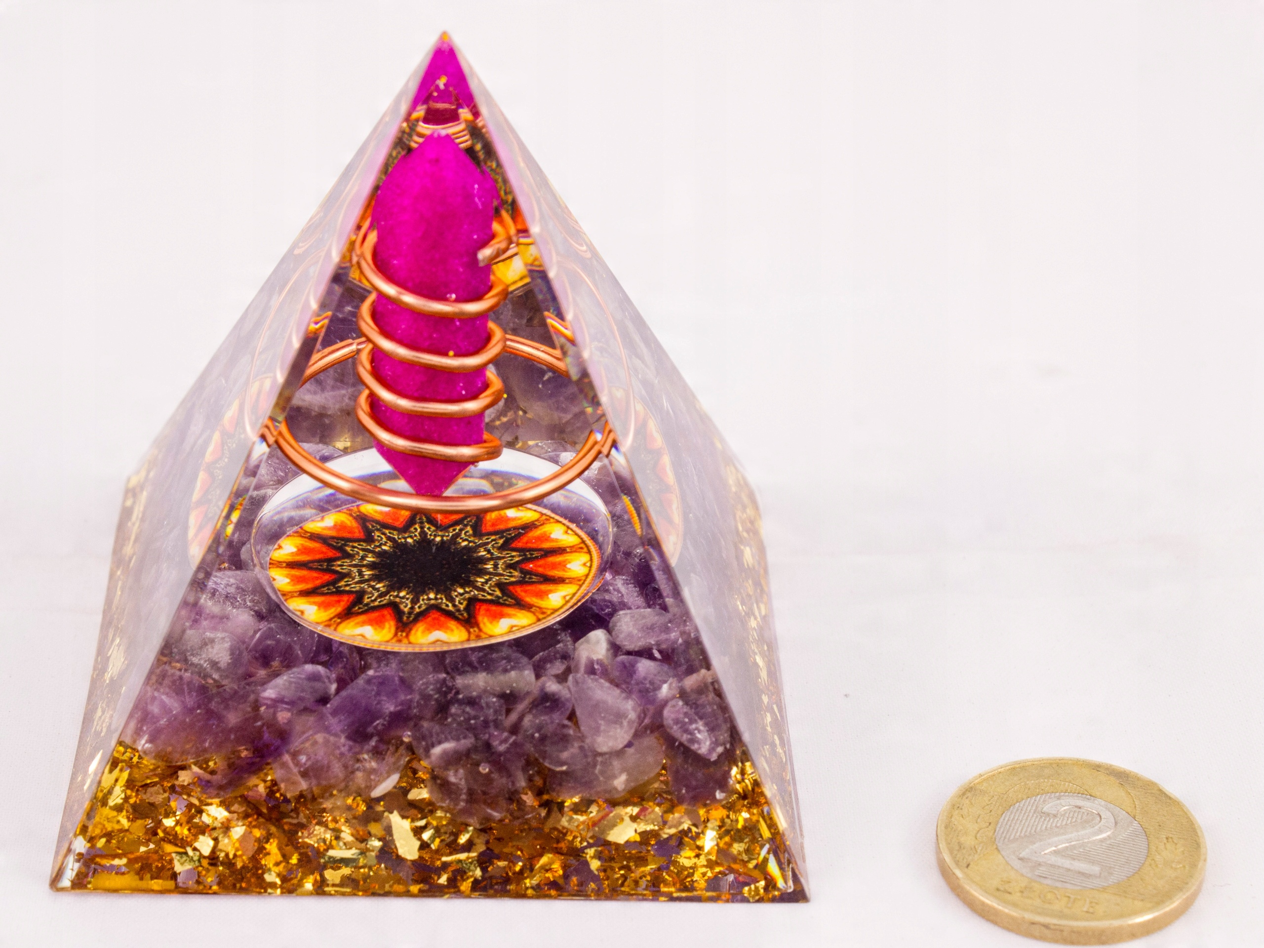 PIĘKNA PIRAMIDA ORGONIT SUGILIT AMETYST MIEDŹ ZŁOTA FOLIA FENG SHUI 6 cm