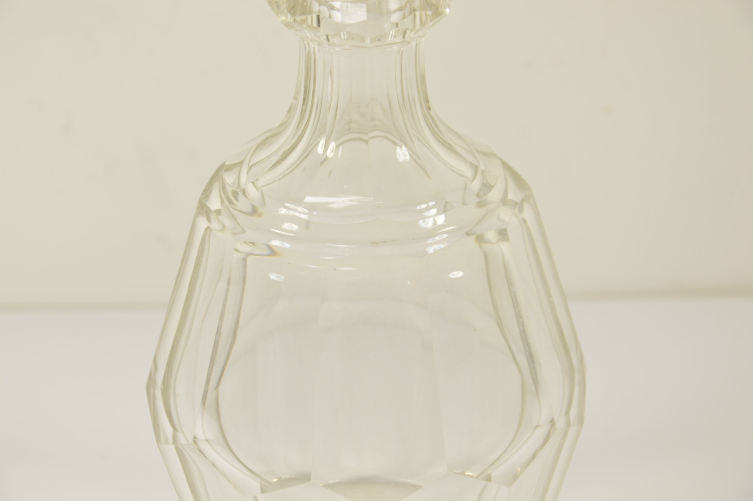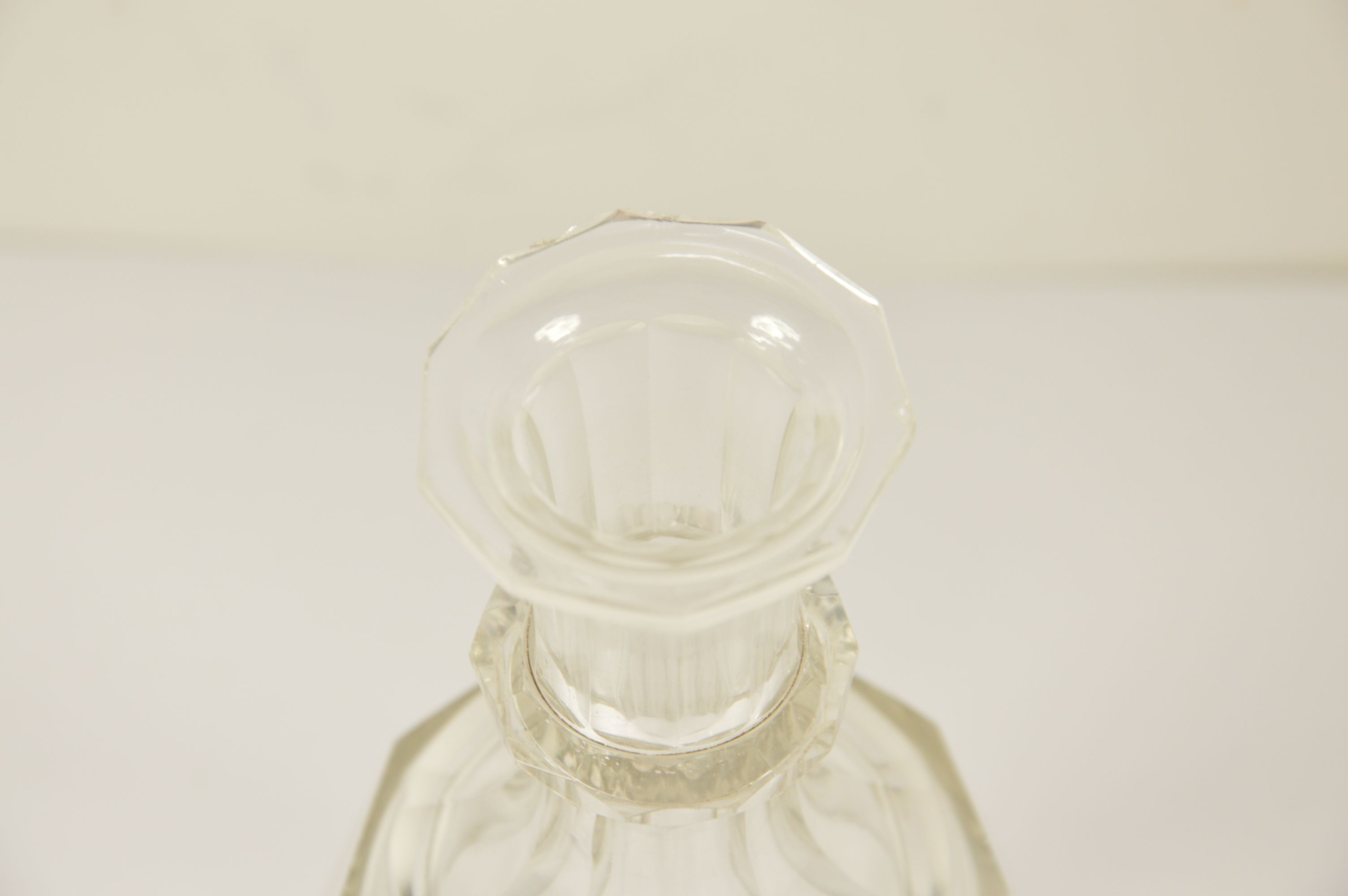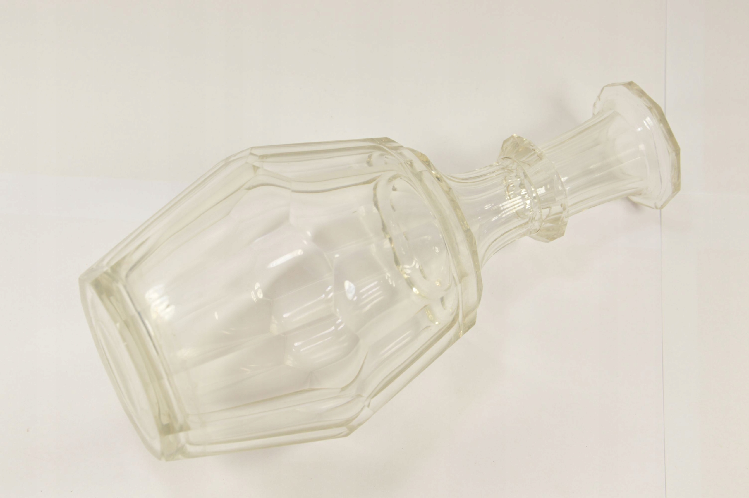 Красивый старый стеклянный графин с пробкой. Выглядит великолепно, стекло разрезано, возле излива видны миниатюрные стеклянные сколы из-за использования графина.
