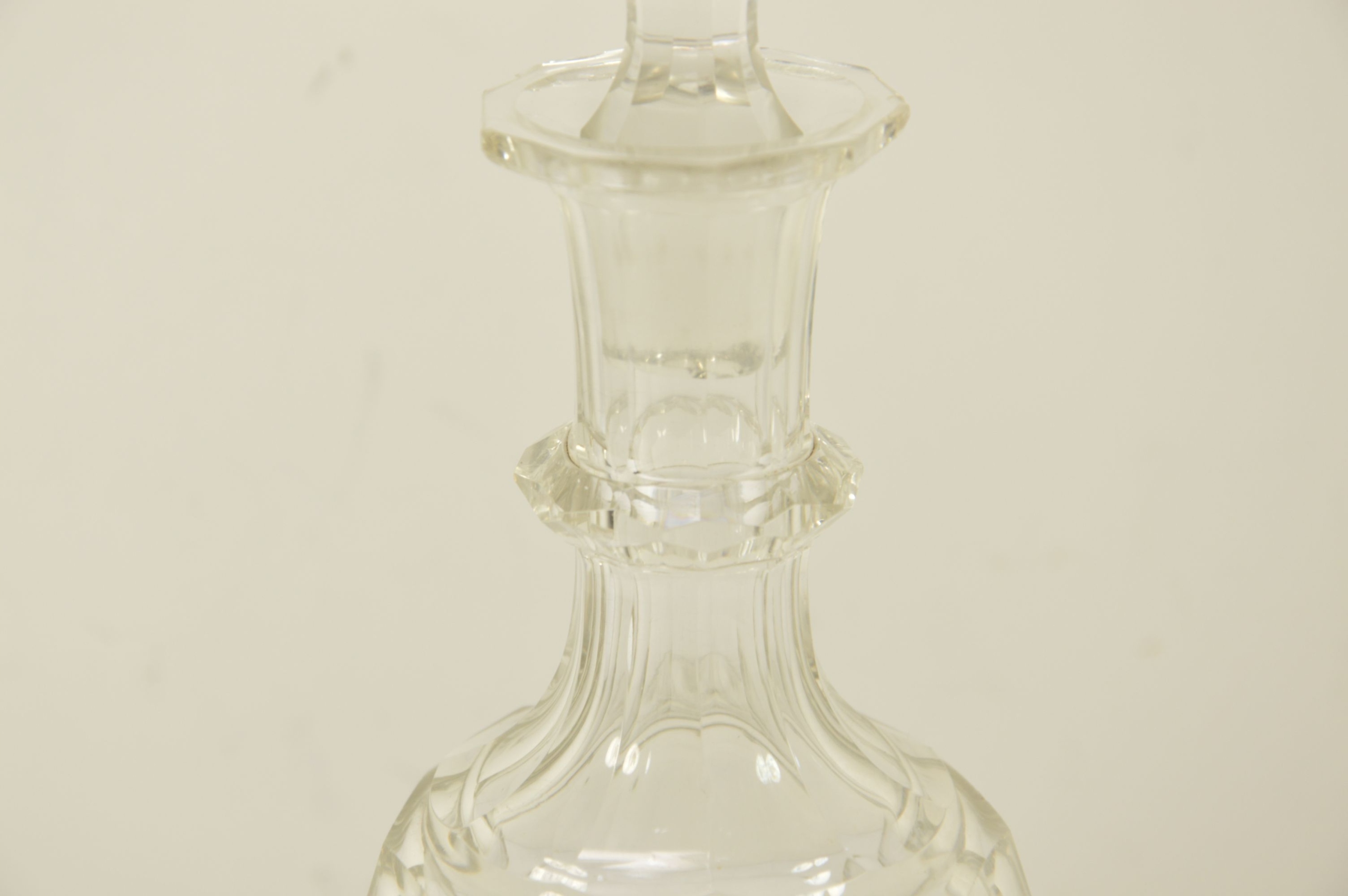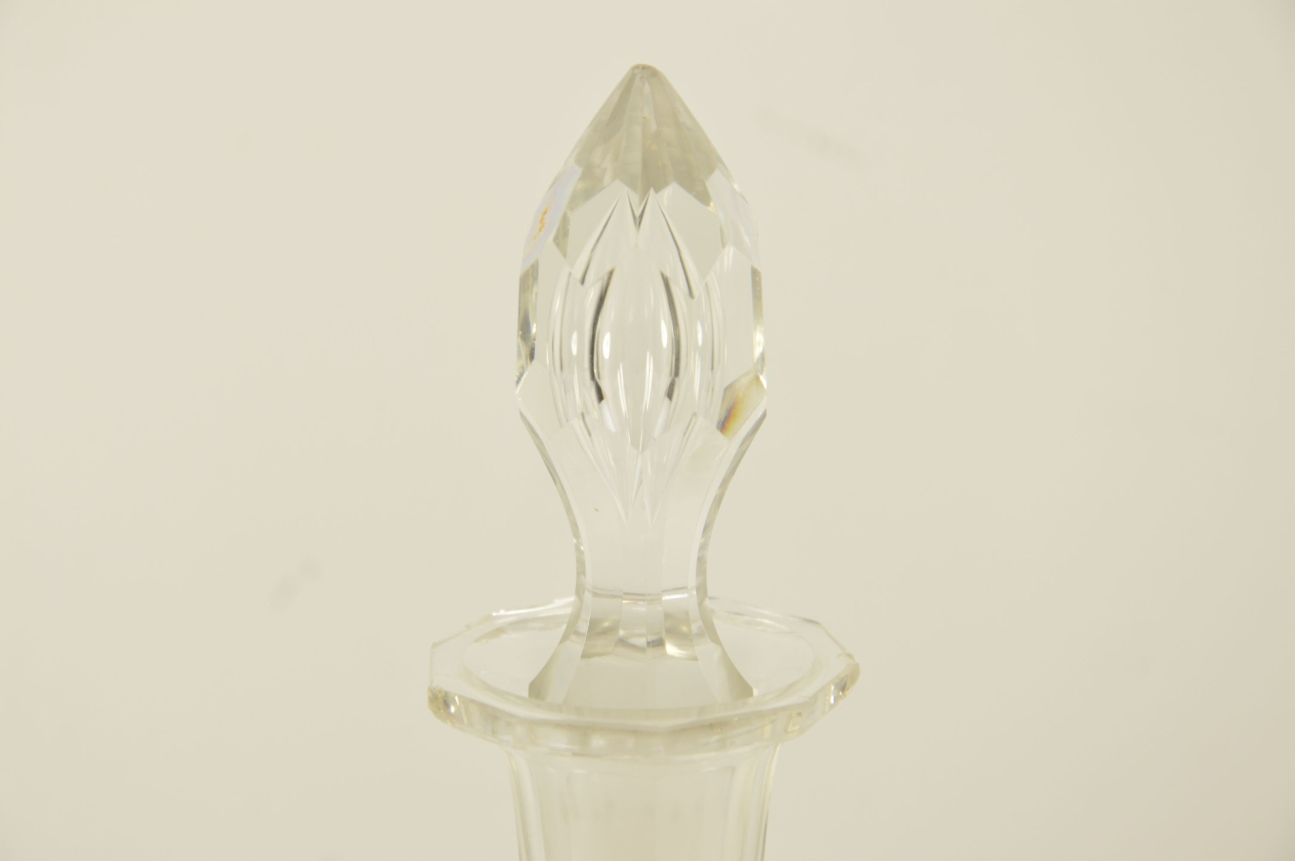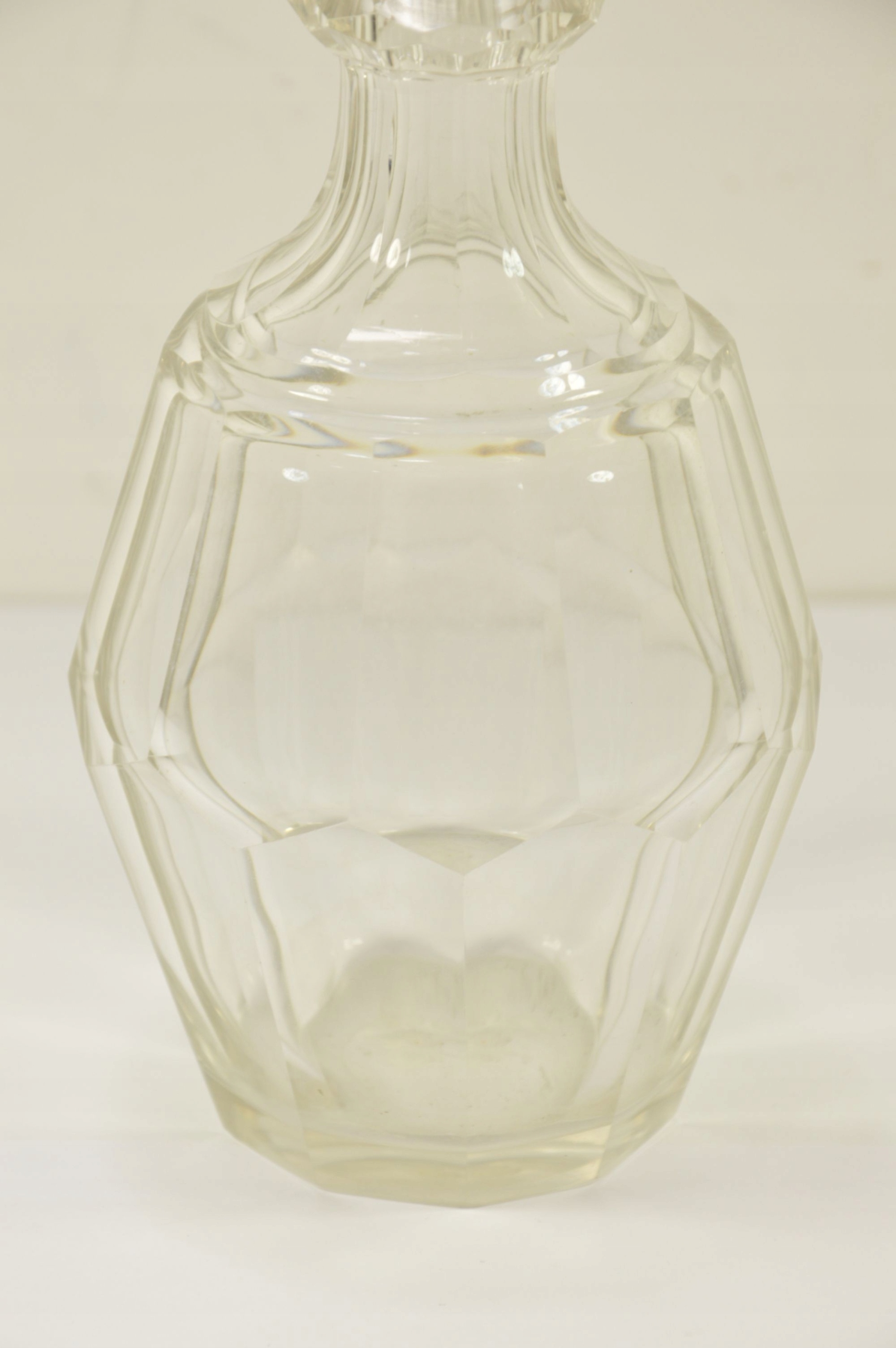 Красивый старый стеклянный графин с пробкой. Выглядит великолепно, стекло разрезано, возле излива видны миниатюрные стеклянные сколы из-за использования графина.