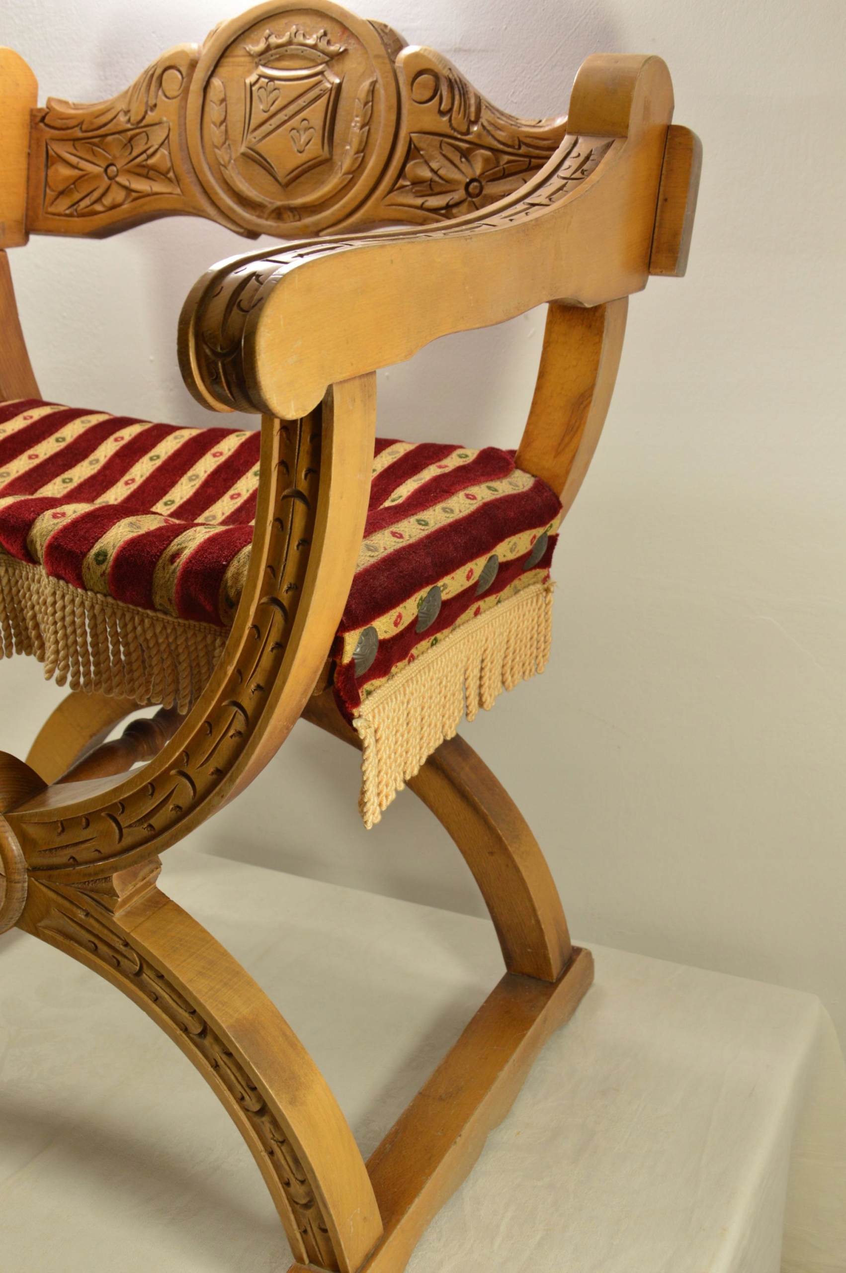 Красивое старинное римское кресло из массива дерева. На спинке богато резной герб. Кресло удобное, полностью функциональное и без повреждений. Видны небольшие следы нормального использования.
