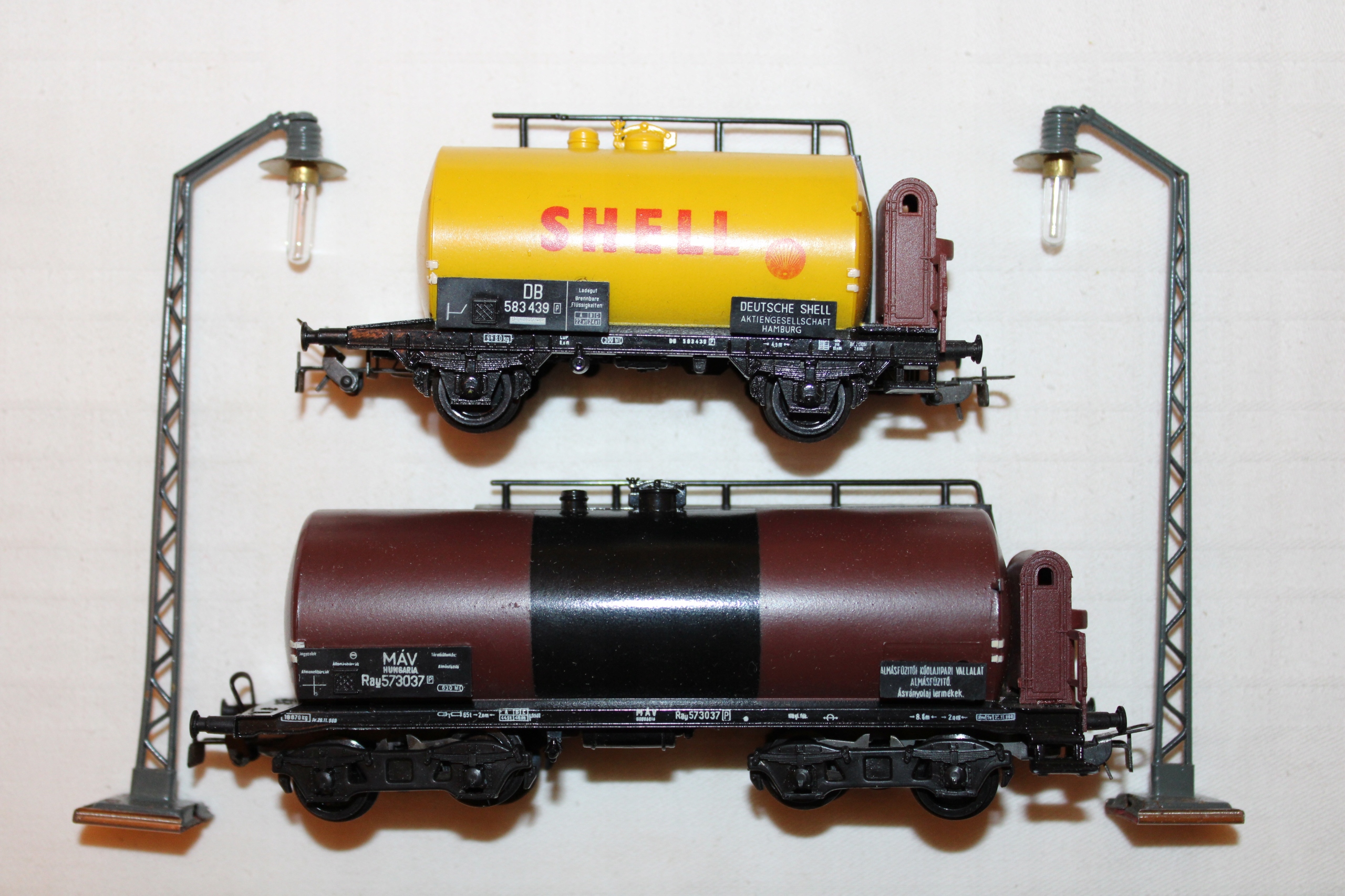 Два оригинальных вагона поезда PIKO, цистерна Shell и цистерна MAV Hungaria, а также две лампы для модели. Вагоны в оригинальных коробках. Цена за комплект.