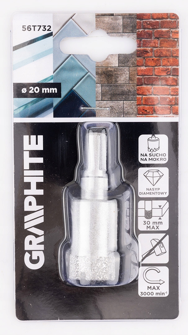 Алмазная кольцевая пила 56T732 диаметром 20 мм от GRAPHITE имеет напаянное алмазное зерно и цилиндрический хвостовик. Он предназначен для эффективного сверления керамогранита, керамики, стекла и кирпича. Он может работать как в мокром, так и в сухом виде, а само бурение происходит без ударов. Максимальная скорость вращения кольцевой пилы составляет 3000 об/мин, а максимальная глубина сверления — 30 мм. Инструмент марки ГРАФИТ предназначен для изготовления отверстий с помощью дрели или дрели-отвертки.
