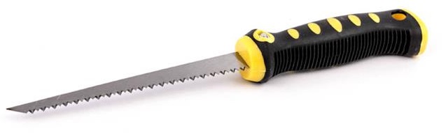 Пила 16/30 мм для резки гипсокартона, строительных материалов, пенопласта и дерева. Лезвие заточено с трёх сторон. Двухкомпонентная ручка с нескользящей резиновой накладкой, крепящаяся винтами. Упаковано в блистер.