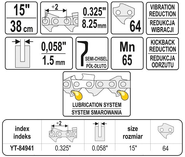 Пильний ланцюг Yato 0,325" 1,5 мм 38 см 64 ланки 15"