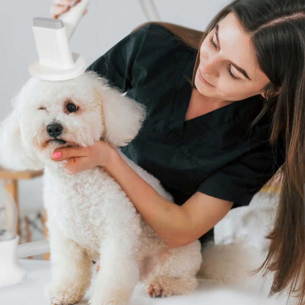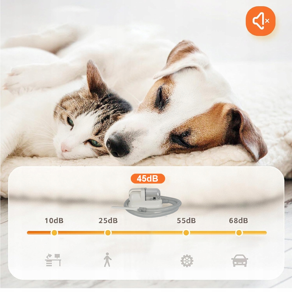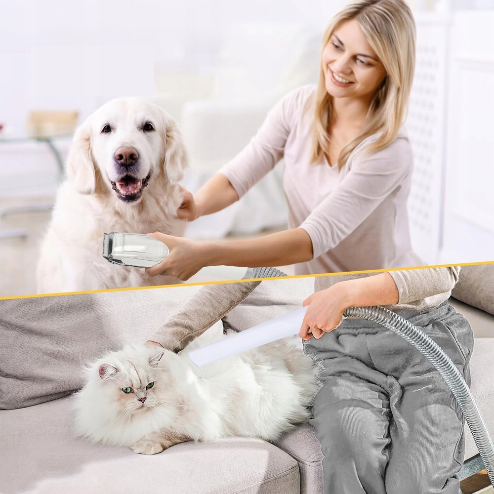- Комплект работает с уровнем шума всего 55 децибел (тише, чем обычный разговор!) и имеет 3 уровня всасывания – для чувствительных собак можно выбрать самый мягкий режим. Никакого страха, только спокойный уход – ваш питомец будет чувствовать себя комфортно на протяжении всей процедуры.