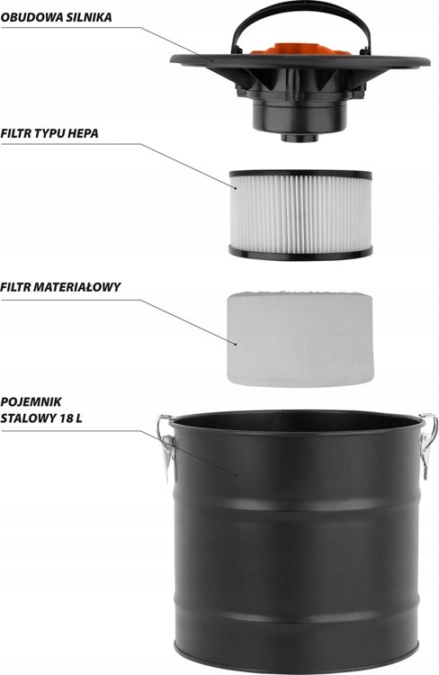 <р> - бак из черного металла емкостью 18Л, <р> - многоступенчатая система фильтрации: фильтр Hepa и материальный фильтр, <р> - термостойкий всасывающий шланг длиной около 1 м с алюминиевым наконечником 23 см, <р> - функция обдува, <р> - складная ручка для переноски устройства, <р> - кабель питания около 3 м.Цель/использование