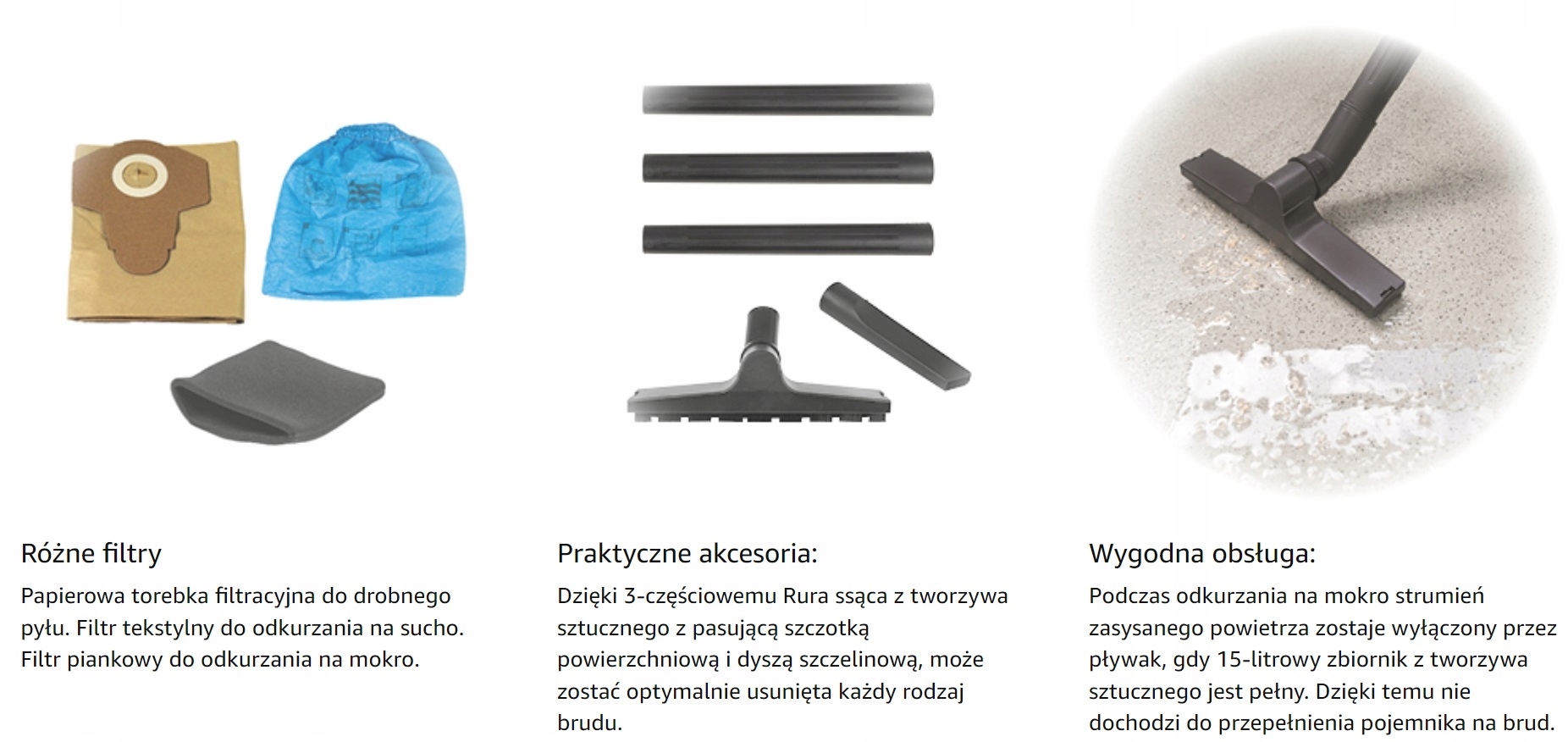 Пылесос для сухой и влажной уборки DC-WDE 1315 P от DELTAFOX имеет мощность всасывания 14 кПа и двигатель мощностью 1250 Вт. Благодаря всасывающему шлангу длиной 1,5 метра, встроенной катушке для кабеля и длине кабеля 2,5 метра . Пылесос на колесах можно легко использовать в любом углу. А благодаря встроенной ручке для переноски и 4 колесам транспортировка также не составит труда. Во время влажной уборки поток всасываемого воздуха перекрывается поплавком, когда 15-литровый пластиковый бак заполнен. Кроме того, устройство имеет функцию обдува, а это значит, что грязь можно легко удалить даже из узких мест и из 3-х частей. Пластиковая всасывающая трубка с подходящей щеткой для поверхности и щелевой насадкой для оптимального удаления грязи.