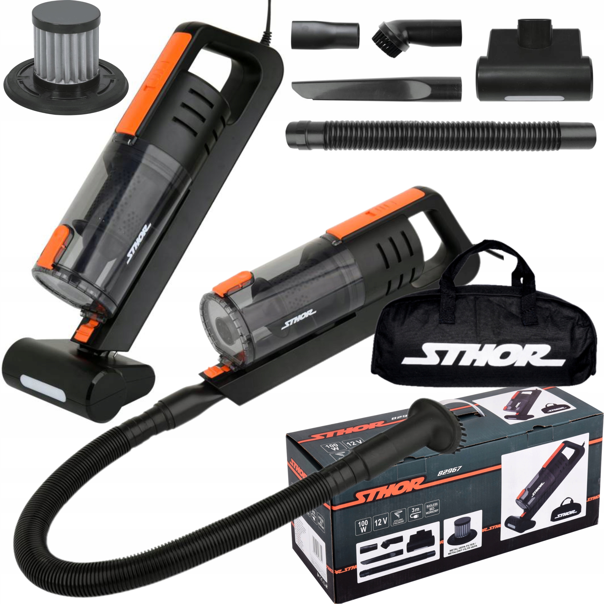 Автомобильный пылесос без мешка мощностью 100 Вт и очень высоким давлением вакуума 5,5 кПа. Входящие в комплект аксессуары позволяют провести комплексную очистку автомобиля, в том числе в труднодоступных местах и углах.