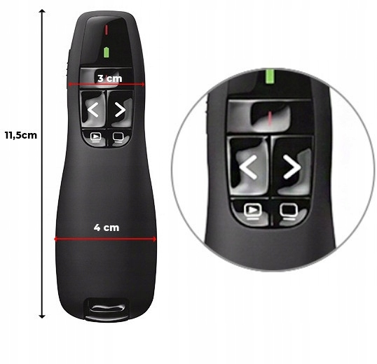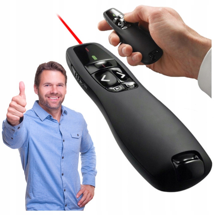 Беспроводной индикатор с диапазоном до 12 метров направлен на то, чтобы помочь представить каждую презентацию. Красный лазер легко увидеть во всех областях проекции, что обеспечивает свободное движение вокруг комнаты и адекватный контакт с аудиторией. Кнопки Slide Show, индикатор заряда и выключателя заряда и выключения батареи, что позволяет вам продлить срок службы батареи