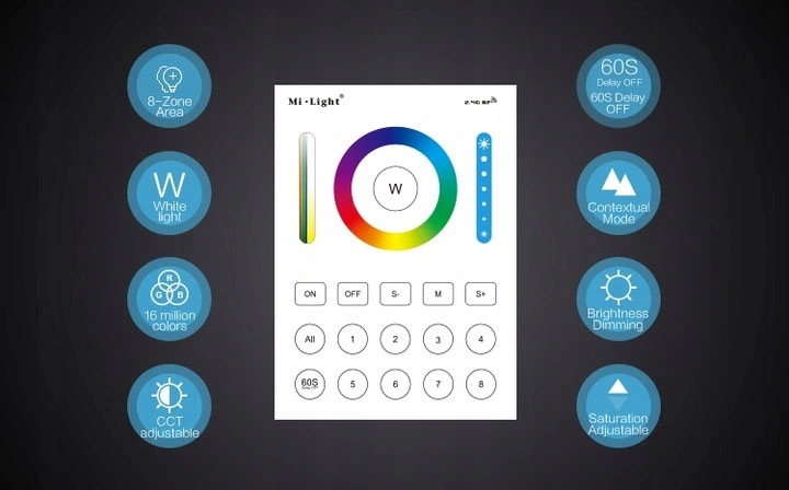 ПАНЕЛЬ дистанционного управления MiLight B8 - 8 зон - это пульт дистанционного управления, выполненный в сенсорной технологии. Пульт дистанционного управления может управлять до 8 зонами! на практике это означает, что с пульта можно управлять от нескольких до нескольких десятков контроллеров, лампочек, галогенных ламп, диодных панелей, разделенных на 8 зон. Зонами можно управлять независимо для каждой зоны или совместно для всех зон!