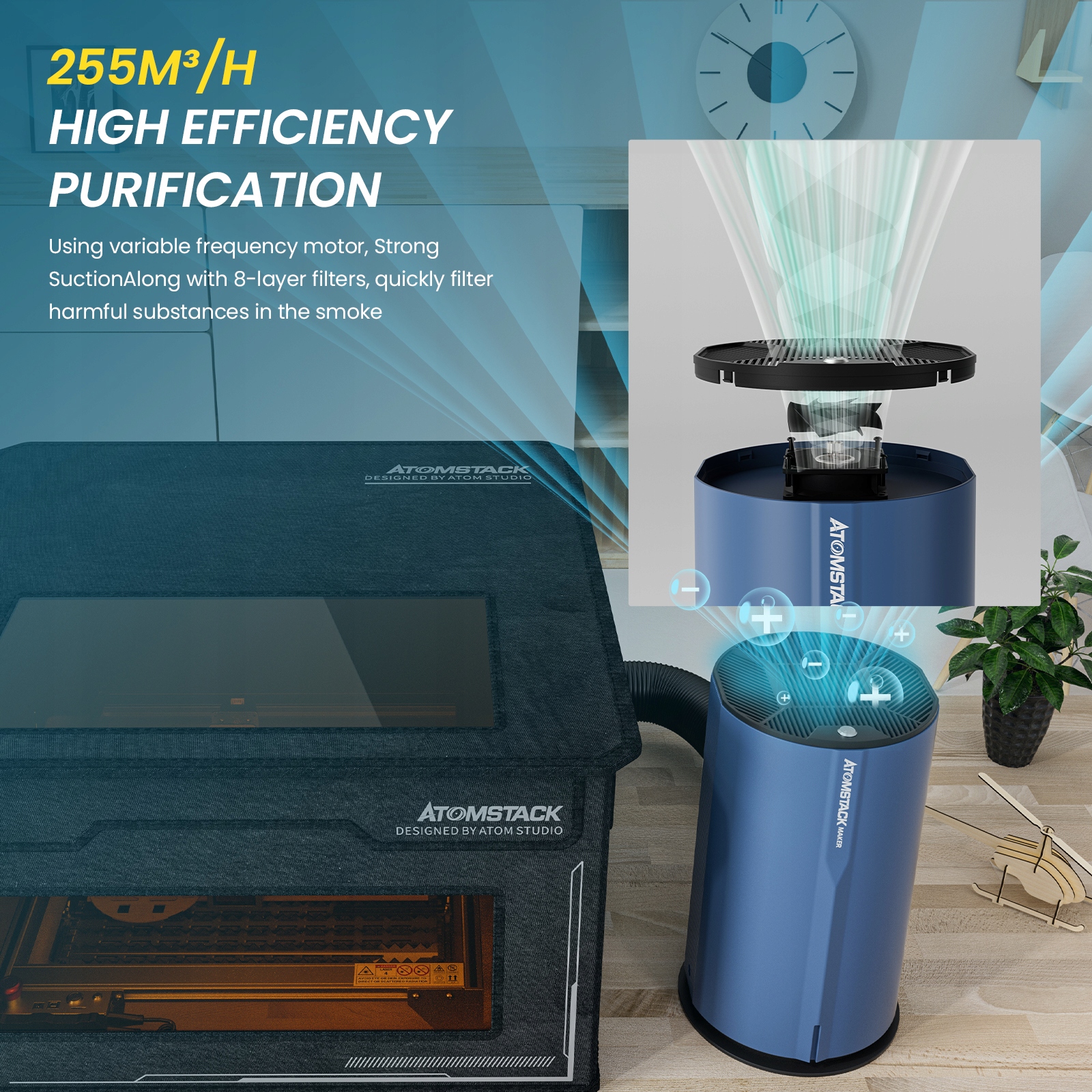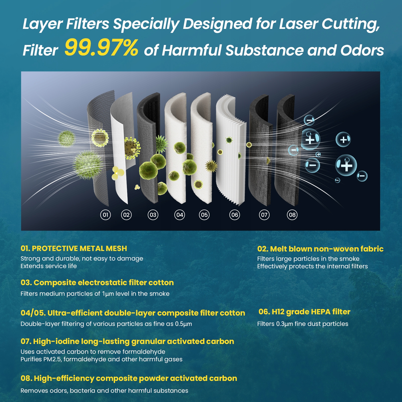 1. Специально разработан для лазерной резки: очиститель воздухаatomstackmaker D2, трехслойный фильтрующий элемент, специально разработанный для лазерной резки, Он может эффективно фильтровать запах и вредные вещества, образующиеся при лазерной резке, а степень фильтрации составляет до 99,5% (данные лабораторных испытанийatomstack).