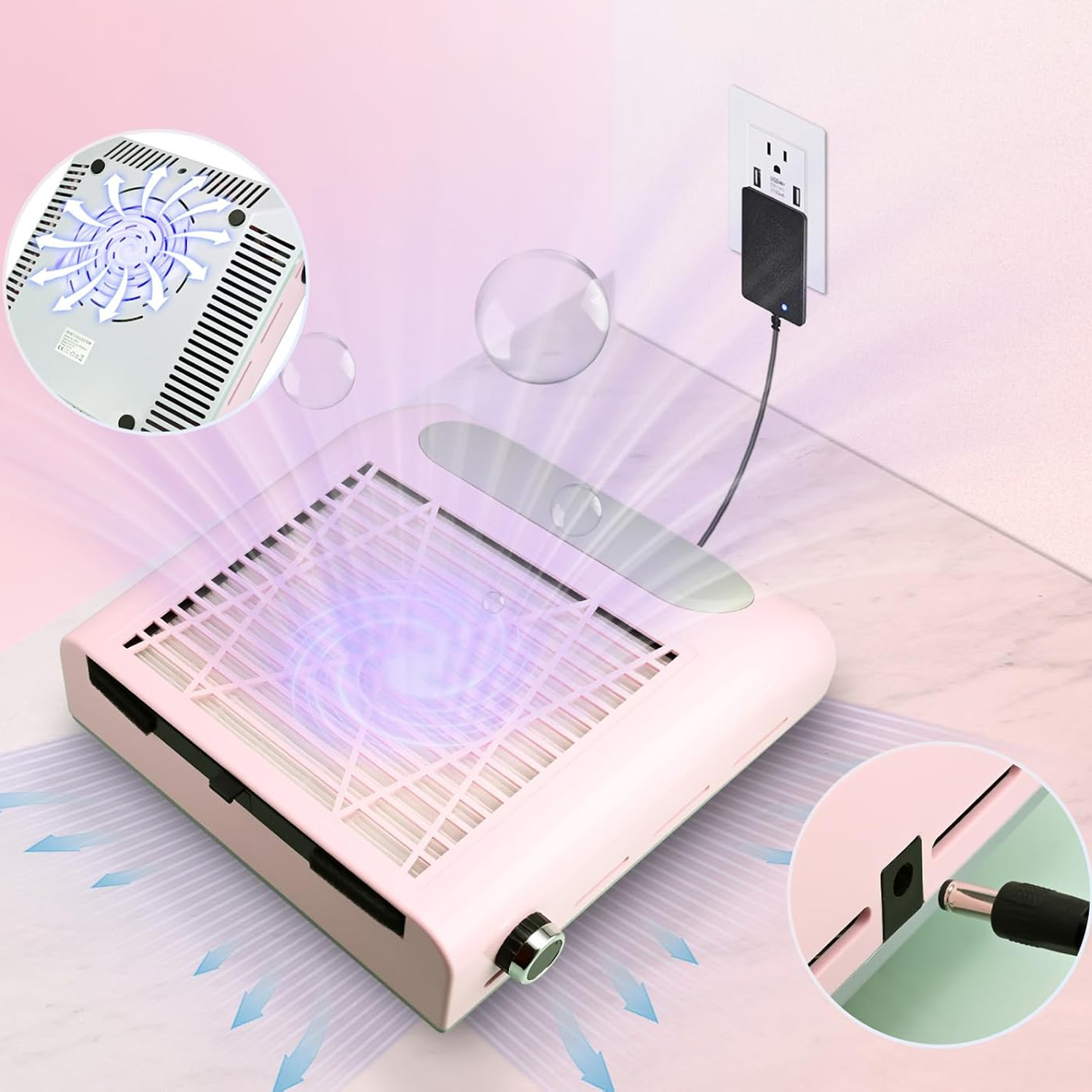 Пылесос для ногтей. Простой поворотный переключатель для удобства эксплуатации. Имеет 2 регулируемые настройки скорости для удовлетворения различных потребностей, а также простой кулисный переключатель для регулировки, обеспечивающий комфорт и эффективность для мастеров маникюра и любителей.