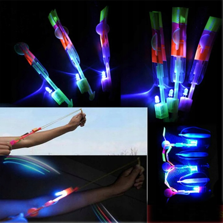 Светодиодная светящаяся вертушка (вертолет) с пусковой установкой. После выстреливая вверх, он превращается, как рогатка, в стрелу, летящую на несколько метров вверх. Он опускается каквертолет благодаря складному пропеллеру — медленно падает на землю. Потрясающие световые эффекты в простой игрушке!