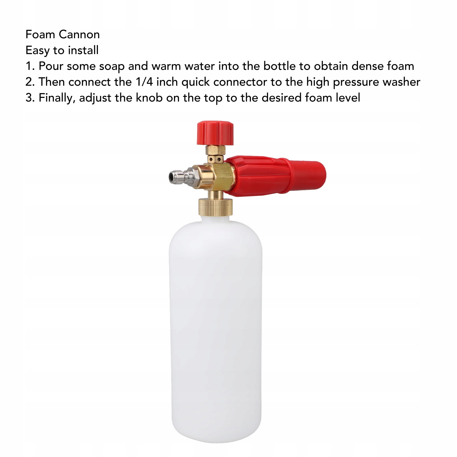 1. Простая установка: просто налейте мыло и теплую воду в бутылку, чтобы образовалась густая пена, затем подключите быстрый разъем 1/4 дюйма к мойке высокого давления (не входит в комплект). Установите верхнюю ручку на желаемый уровень пены, и распылитель пены начнет подавать густую пену.