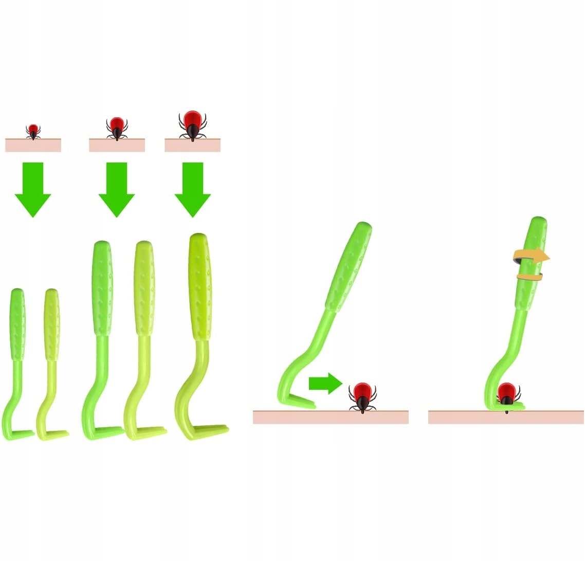 - Легко удаляет клещей и блох. Больше не нужно тратить время на удаление клещей пинцетом. Наши средства помогут вам избавиться от клещей с головокружительной скоростью. Просто нажмите, зафиксируйте, поверните и потяните. Средство для удаления вшей в трех размерах, выберите наиболее подходящий крючок в зависимости от размера клеща.
