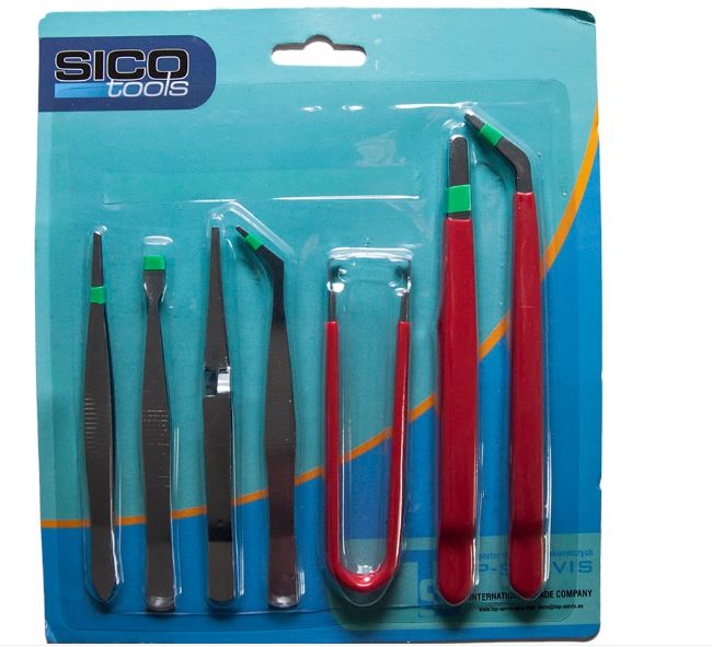 - Набор из 7 различных пинцетов длиной 115–150 мм.