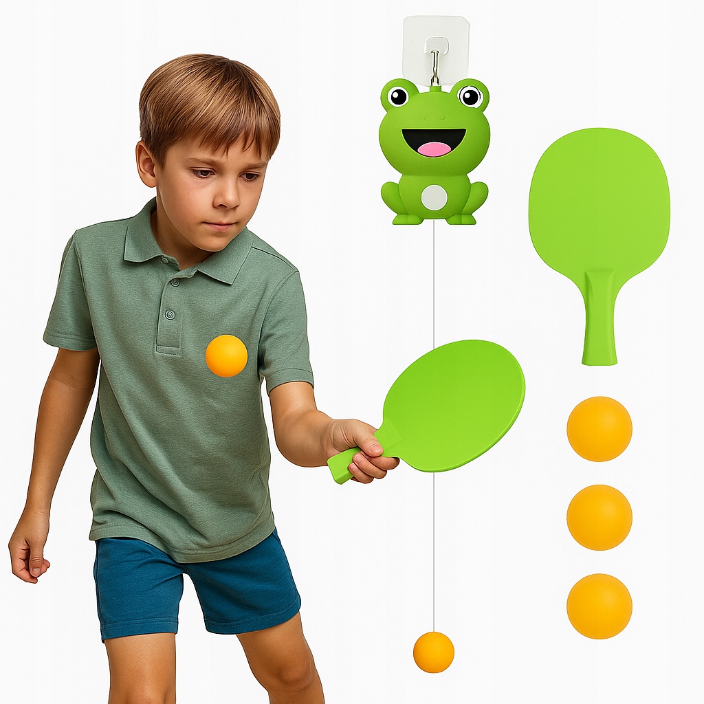 Вы ищете идею для активного развлечения со своим ребенком, и, кстати, вы хотите пробудить спортивную страсть? Pingpongo Table Tennis set является простым, и в то же время блестящий способ ежедневного рефлекса и координационного обучения - без необходимости иметь таблицу для Ping Pong! Вы можете установить эту подвесную систему через несколько секунд над дверью, создавая мобильный тренировочный подача дома, в саду или даже в гараже.