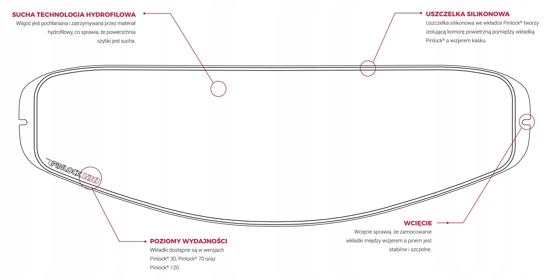 - Герметичная камера: внутренний край козырька Pinlock30 имеет силиконовую прокладку, благодаря которой он работает по принципу создания герметичной воздушной камеры.