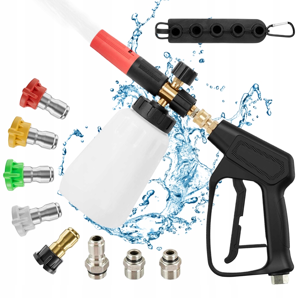 - Пистолет для пенопластовой шайбы оснащен 5 металлическими соплами с быстрым соединением (0 °/15 °/25 °/40 °/65 °), вода течет от сильной к деликатному распылению.