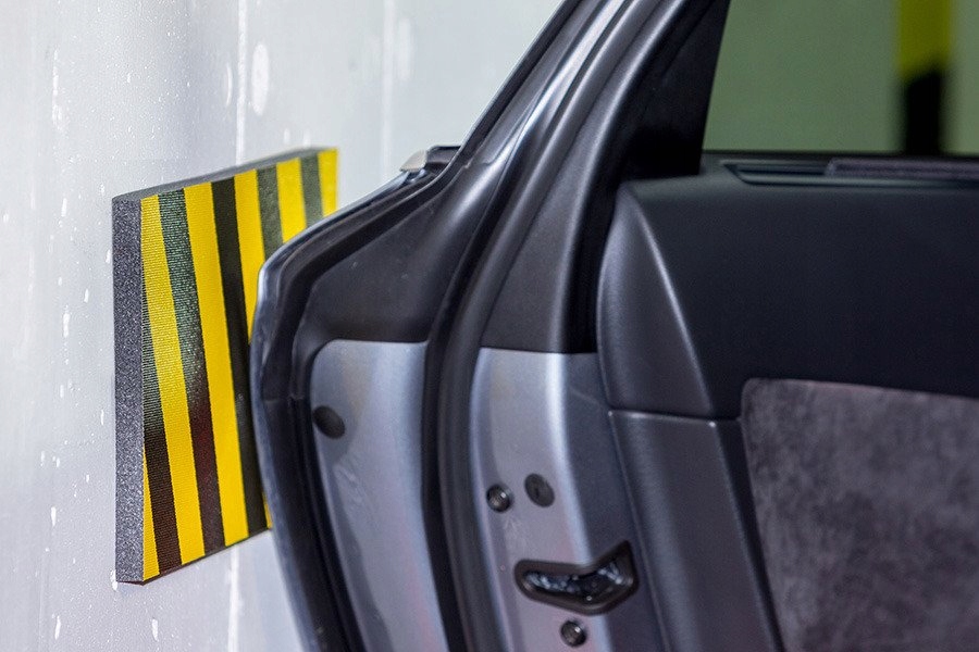 Губчатая защитная полоса для стены в предупреждающих цветах: красном и черном. Размеры 50см х 10см х 2см. Идеально подходит для защиты двери вашего автомобиля от удара о стену гаража.