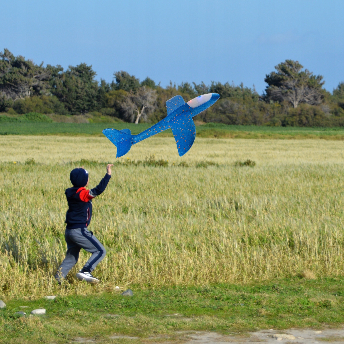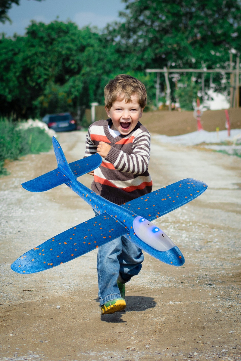 ✅Различные варианты игры - в самолете есть два отверстия, благодаря которым ребенок может определяться с траекторией полета и акробатикой. Вставка стабилизатора в верхнее отверстие приведет к полету, полному акробатических фигур (восьмерки, бочки). Выбор нижнего отверстия приведет к скольжению по прямой.