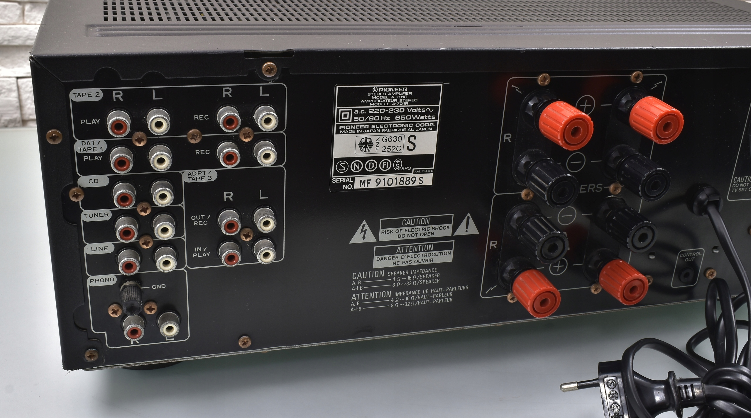steer. Я думаю, что это один из лучших усилителей по этой цене. Это самая высокая модель в этой серии. Преемник культового A-777. Несмотря на то, что это выглядит незаметно на фотографиях, это настоящий колосс. Улучшение очень массивное, структура жесткая, весит 13 кг. Алюминиевая передняя панель. Он использует типичный набор регуляторов цвета: низкий, высокий и контур. Набор функций, которые предлагают, это отлично подходит для сердца хорошего стереоподобного набора. Звук динамичен с сильным басом. Pionioneer, как всегда, предлагает солидный транзисторный звук, хорошую динамику и острую стереофонию. Потребляемое энергопотребление в этом усилителе составляет 650 Вт, поэтому достаточно для управления очень требовательными столбцами. Я рекомендую !!! Усилитель находится в очень хорошем техническом состоянии. Это оборудование подписано в качестве справочной аудио -амплифера, это отражается в качестве его производительности (самый короткий путь сигнальных путей, длинные ручки, огромный трансформатор, мощные конденсаторы, распределение элементов внутри корпуса).
