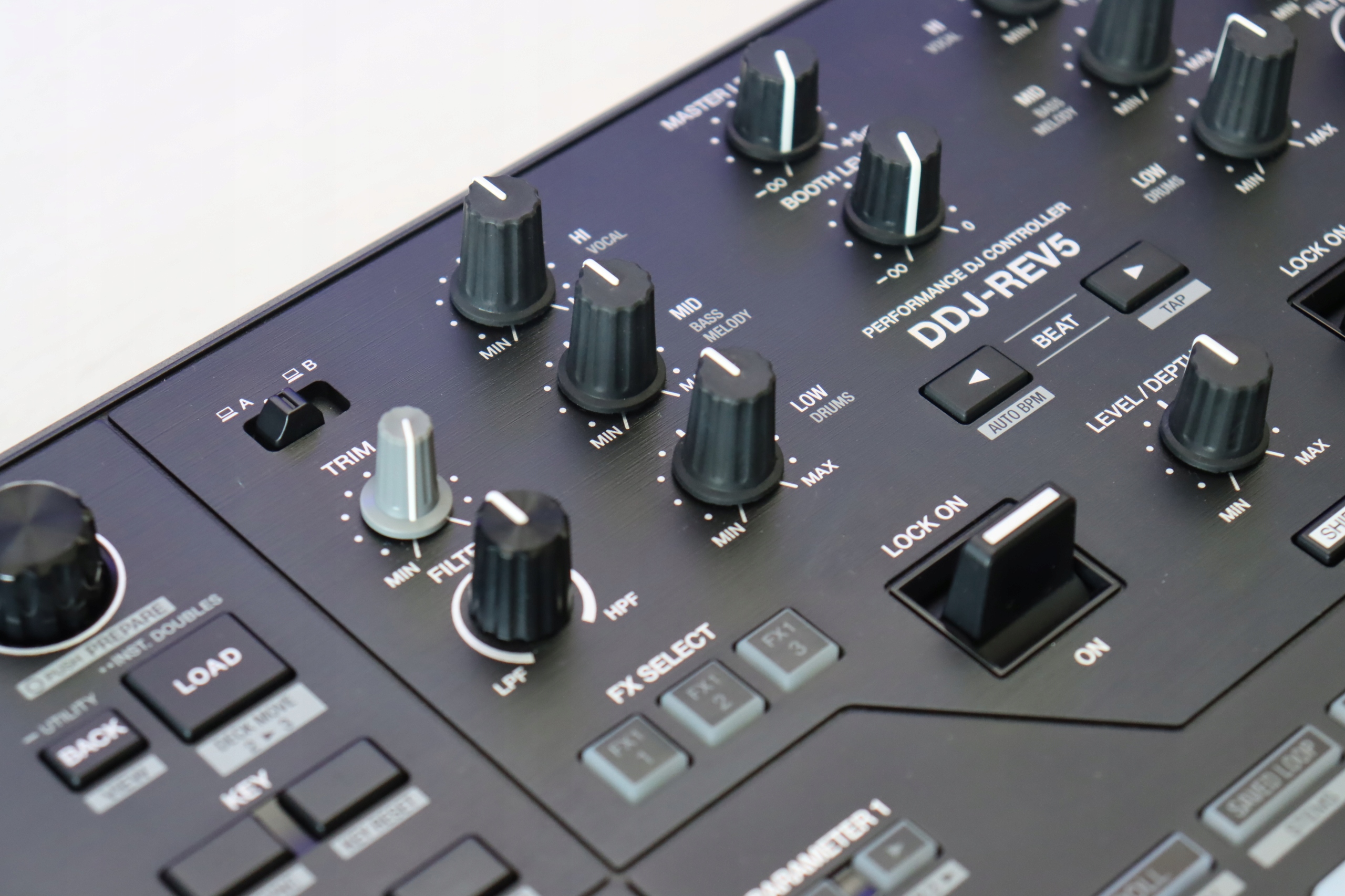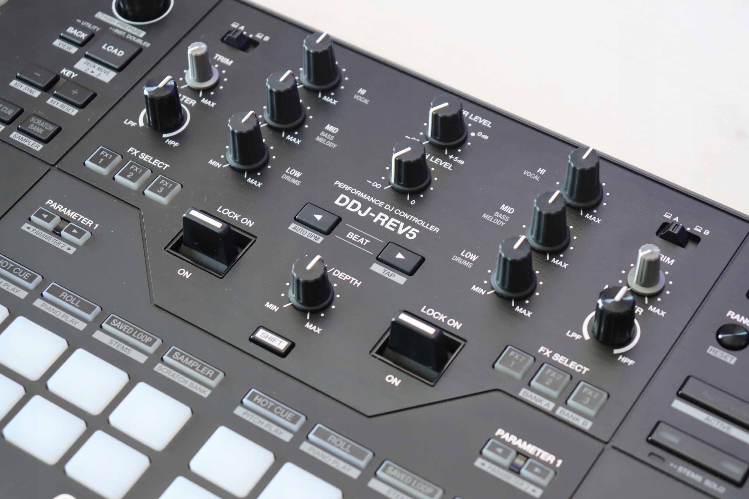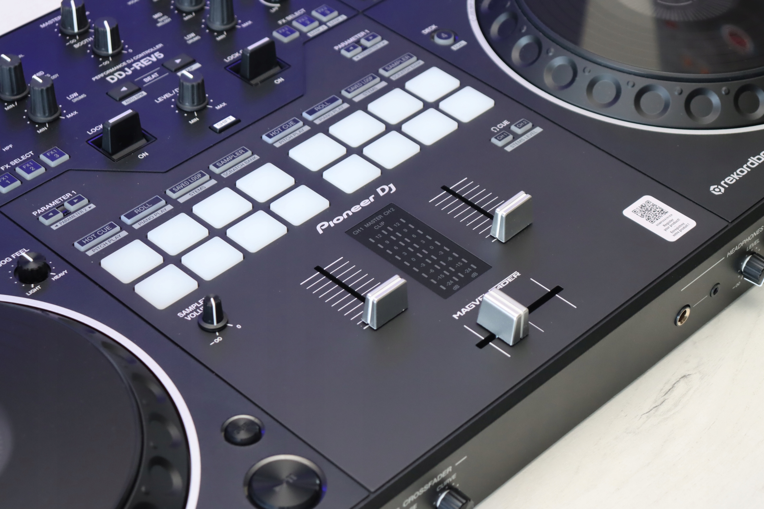 Система стиля царапин, обеспечивающая бесплатное формат - ползунки PACE в DDJ -REV5 горизонтально над разделами палуб, в то время как Performance Pads и Lever FX помещаются в раздел микшера для получения динамических характеристик, подражая конфигурациям серии PLX + Series Series Series Series Миксеры из серии DJM-S